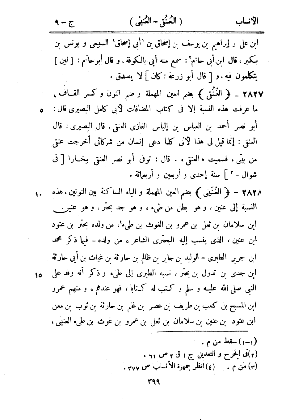 بضم العين المهملة والياء الساكنة بين النونين، هذه النسبة إلى عنين، وهو بطن من طيِّئ، وهو جد بحتر، وهو عنين ابن سلامان بن ثعل بن عمرو بن الغوث بن طيِّئ [4] ، من ولده بحتر بن عتود ابن عنين، الّذي ينسب إليه البحتري الشاعر من ولده- فيما ذكر محمد ابن جرير الطبري- الوليد بن جابر بن ظالم بن حارثة بن غياث بن أبى حارثة ابن جدي بن تدول بن بحتر، نسبه الطبري إلى طيِّئ وذكر أنه وفد على النبي صلى الله عليه وسلم وكتب له كتابا، فهو عندهم ومنهم عمرو ابن المسبح بن كعب بن طريف بن عصر بن غنم بن حارثة بن ثوب بن معن ابن عتود بن عنين بن سلامان بن ثعل بن عمرو بن غوث بن طيِّئ العنينى،