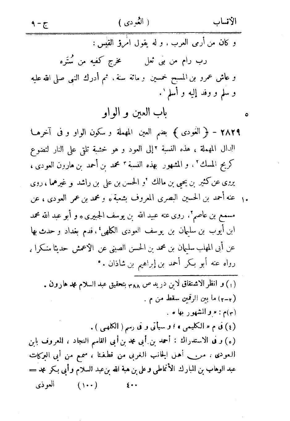 بضم العين المهملة وسكون الواو وفي آخرها الدال المهملة، هذه النسبة [2] إلى العود وهو خشبة تلقى على النار لتضوع كريح المسك [3] ، والمشهور بهذه النسبة [3] محمد بن أحمد بن هارون العودي، يروى عن كثير بن يحيى بن مالك [2] والحسن بن على بن راشد وغيرهما، روى عنه أحمد بن الحسين البصري المعروف بشعبة ومحمد بن عمر العودي، عن مسمع بن عاصم [2] ، روى عنه عبيد الله بن يوسف الجبيرى وأبو عبد الله محمد ابن أيوب بن سليمان بن يوسف العودي الكلهى [4] ، قدم بغداد وحدث بها عن أبى المهلب سليمان بن محمد بن الحسن الصيني عن الأعمش حديثا منكرا، رواه عنه أبو بكر أحمد بن إبراهيم بن شاذان. [5]
