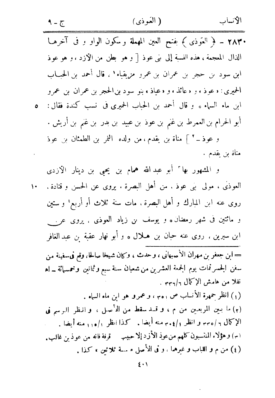 والمشهور بها [3] أبو عبد الله همام بن يحيى بن دينار الأزدي العوذى، مولى بنى عوذ، من أهل البصرة، يروى عن الحسن وقتادة، روى عنه ابن المبارك وأهل البصرة، مات سنة ثلاث أو أربع [4] وستين ومائتين في شهر رمضان ويوسف بن زياد العوذى، يروى عن ابن سيرين، روى عنه حبان بن هلال وأبو نهار عقبة بن عبد الغافر