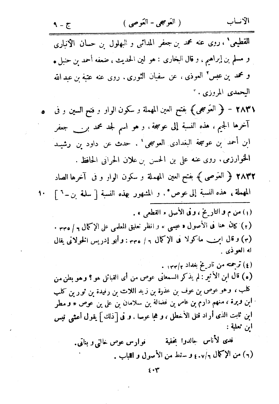 بفتح العين المهملة وسكون الواو وفتح السين وفي آخرها الجيم، هذه النسبة إلى عوسجة، وهو اسم لجد محمد بن جعفر ابن أحمد بن عوسجة البغدادي العوسجى [4] ، حدث عن داود بن رشيد الخوارزمي، روى عنه على بن الحسن بن علان الحراني الحافظ.