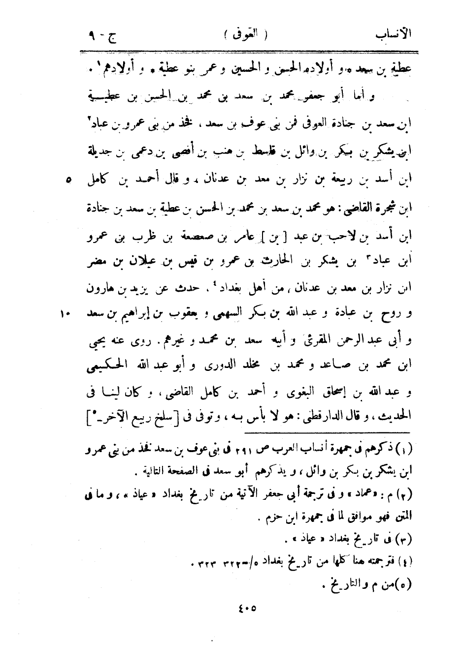 وأما أبو جعفر محمد بن سعد بن محمد بن الحسن بن عطية ابن سعد بن جنادة العوفيّ فمن بنى عوف بن سعد، فخذ من بنى عمرو بن عباد [2] ابن يشكر بن بكر بن وائل بن قاسط بن هنب بن أفصى بن دعمي بن جديلة ابن أسد بن ربيعة بن نزار بن معد بن عدنان، وقال أحمد بن كامل ابن شجرة القاضي: هو محمد بن سعد بن محمد بن الحسن بن عطية بن سعد بن جنادة ابن أسد بن لاحب بن عبد [بن] عامر بن صعصعة بن ظرب بن عمرو ابن عباد [3] بن يشكر بن الحارث بن عمرو بن قيس بن عيلان بن مضر ابن نزار بن معد بن عدنان، من أهل بغداد [4] ، حدث عن يزيد بن هارون وروح بن عبادة وعبد الله بن بكر السهمي ويعقوب بن إبراهيم بن سعد وأبى عبد الرحمن المقرئ وأبيه سعد بن محمد وغيرهم، روى عنه يحيى ابن محمد بن صاعد ومحمد بن مخلد الدوري وأبو عبد الله الحكيمي وعبد الله بن إسحاق البغوي وأحمد بن كامل القاضي، وكان لينا في الحديث، وقال الدار قطنى: هو لا بأس به، وتوفى في [سلخ ربيع الآخر-[5]]