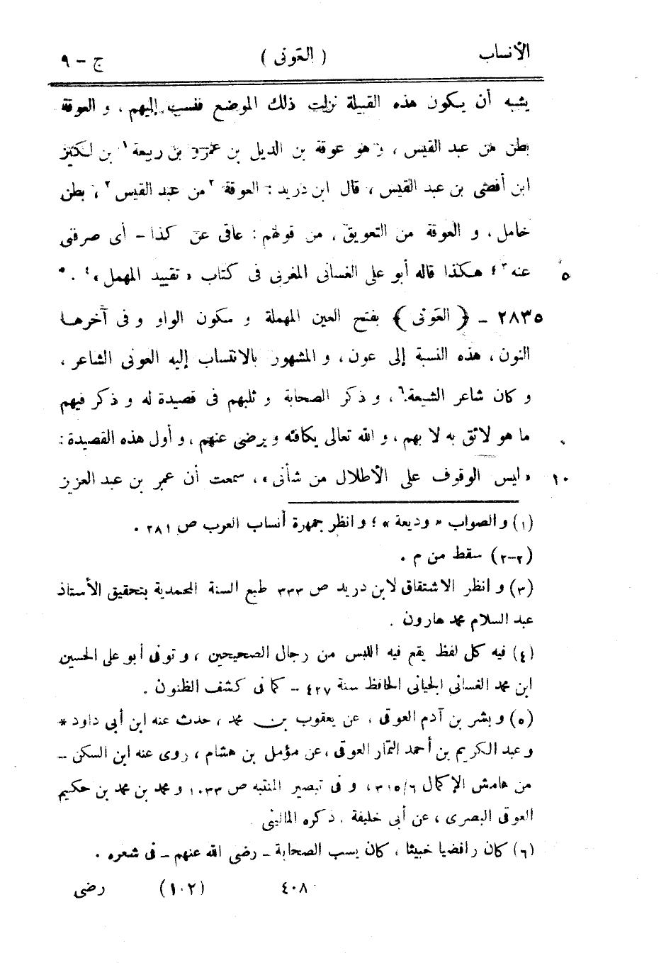 بفتح العين المهملة وسكون الواو وفي آخرها النون، هذه النسبة إلى عون، والمشهور بالانتساب إليه العوني الشاعر، وكان شاعر الشيعة. [6] ، وذكر الصحابة وثلبهم في قصيدة له وذكر فيهم ما هو لائق به لا بهم، والله تعالى يكافئه ويرضى عنهم، وأول هذه القصيدة: