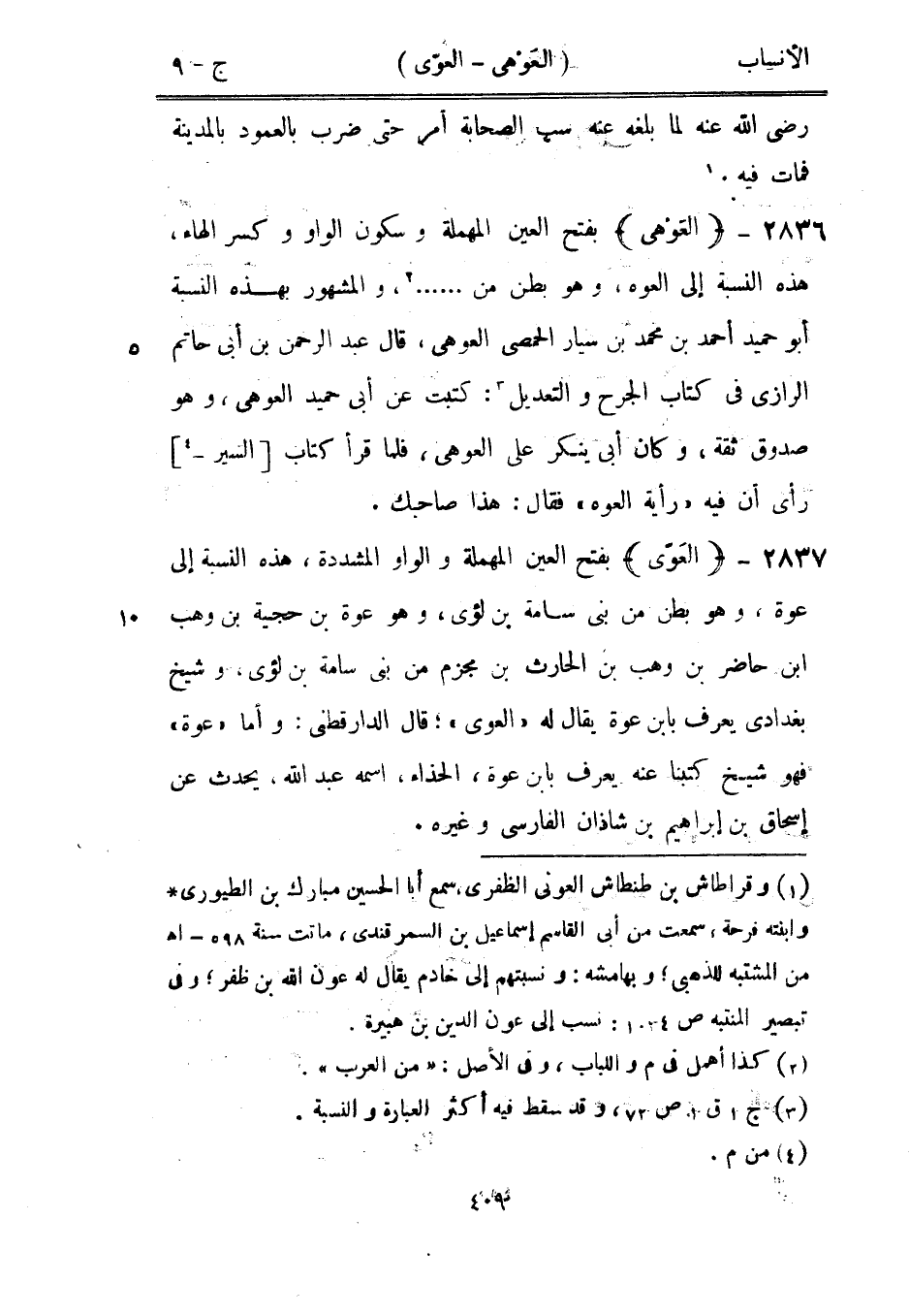 بفتح العين المهملة وسكون الواو وكسر الهاء، هذه النسبة إلى العوه، وهو بطن من ... [2] ، والمشهور بهذه النسبة أبو حميد أحمد بن محمد بن سيار الحمصي العوهى، قال عبد الرحمن بن أبى حاتم الرازيّ في كتاب الجرح والتعديل [3] : كتبت عن أبى حميد العوهى، وهو صدوق ثقة، وكان أبى ينكر على العوهى، فلما قرأ كتاب [السير-[4]] رأى أن فيه «رأية العوه» فقال: هذا صاحبك.