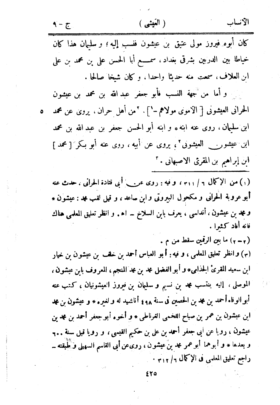 وأما من جهة النسب فأبو جعفر عبد الله بن محمد بن عيشون الحراني العيشونى [الأموي مولاهم-[1]] . [2] من أهل حران، يروى عن محمد ابن سليمان، روى عنه ابنه وابنه أبو الحسن جعفر بن عبد الله بن محمد ابن عيشون العيشونى [2] ، يروى عن أبيه، روى عنه أبو بكر [محمد] ابن إبراهيم بن المقرئ الأصبهاني. [3]