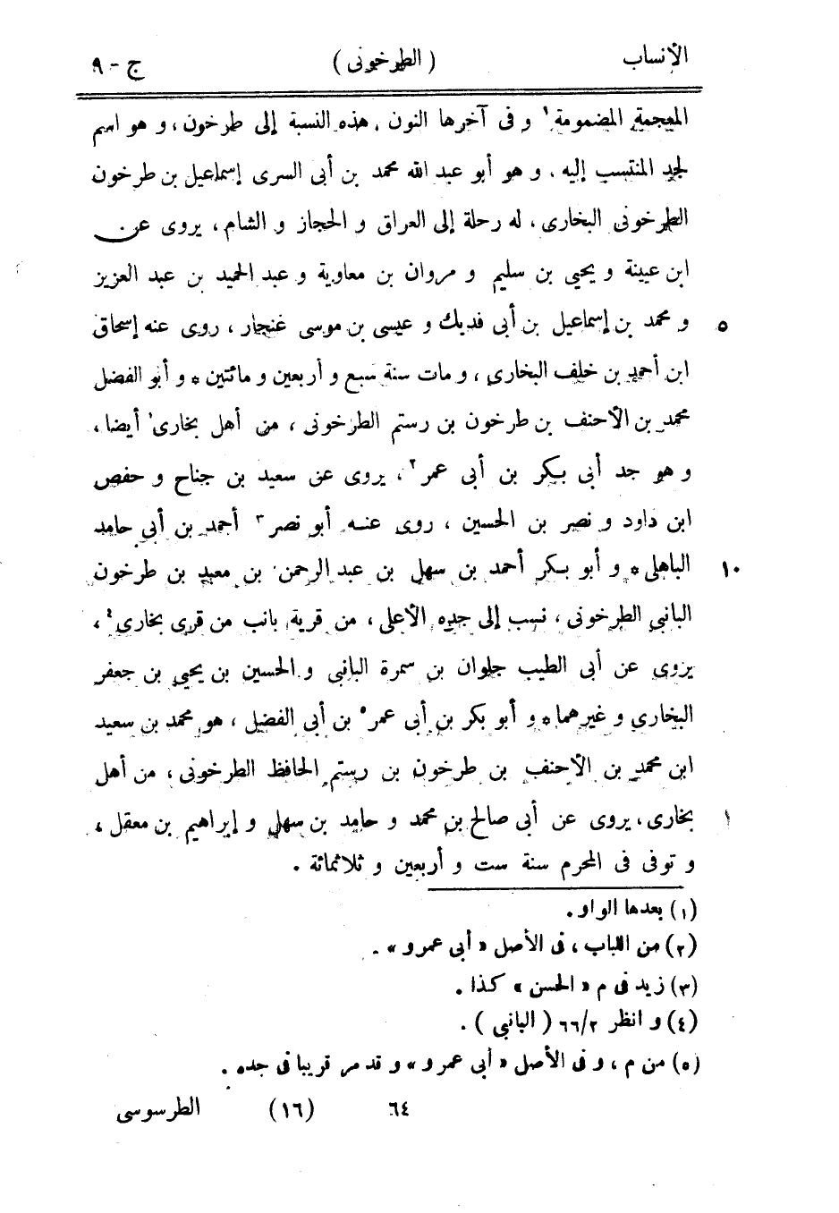 المعجمة المضمومة [1] وفي آخرها النون، هذه النسبة إلى طرخون، وهو اسم لجد المنتسب إليه، وهو أبو عبد الله محمد بن أبى السري إسماعيل بن طرخون الطرخونى البخاري، له رحلة إلى العراق والحجاز والشام، يروى عن ابن عيينة ويحيى بن سليم ومروان بن معاوية وعبد الحميد بن عبد العزيز ومحمد بن إسماعيل بن أبى فديك وعيسى بن موسى غنجار، روى عنه إسحاق ابن أحمد بن خلف البخاري، ومات سنة سبع وأربعين ومائتين وأبو الفضل محمد بن الأحنف بن طرخون بن رستم الطرخونى، من أهل بخارى [1] أيضا، وهو جد أبى بكر بن أبى عمر [2] ، يروى عن سعيد بن جناح وحفص ابن داود ونصر بن الحسين، روى عنه أبو نصر [3] أحمد بن أبى حامد الباهلي وأبو بكر أحمد بن سهل بن عبد الرحمن بن معبد بن طرخون البانبي الطرخونى، نسب إلى جده الأعلى، من قرية بانب من قرى بخارى [4] ، يروى عن أبى الطيب جلوان بن سمرة البانبي والحسين بن يحيى بن جعفر البخاري وغيرهما وأبو بكر بن أبى عمر [5] بن أبى الفضل، هو محمد بن سعيد ابن محمد بن الأحنف بن طرخون بن رستم الحافظ الطرخونى، من أهل بخارى، يروى عن أبى صالح بن محمد وحامد بن سهل وإبراهيم بن معقل، وتوفى في المحرم سنة ست وأربعين وثلاثمائة.