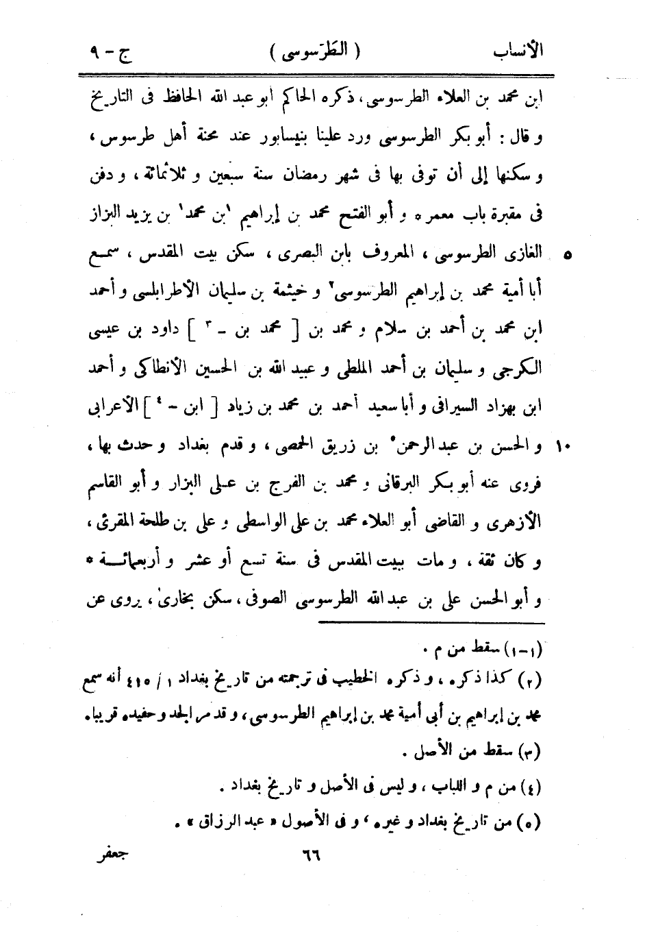 ابن محمد بن العلاء الطرسوسي، ذكره الحاكم ابو عبد الله الحافظ في التاريخ وقال: أبو بكر الطرسوسي ورد علينا بنيسابور عند محنة أهل طرسوس، وسكنها إلى أن توفى بها في شهر رمضان سنة سبعين وثلاثمائة، ودفن في مقبرة باب معمر وأبو الفتح محمد بن إبراهيم [1] بن محمد [1] بن يزيد البزاز الغازي الطرسوسي، المعروف بابن البصري، سكن بيت المقدس، سمع أبا أمية محمد بن إبراهيم الطرسوسي [2] وخيثمة بن سليمان الأطرابلسي وأحمد ابن محمد بن أحمد بن سلام ومحمد بن [محمد بن-[3]] داود بن عيسى الكرجي وسليمان بن أحمد الملطي وعبيد الله بن الحسين الأنطاكي وأحمد ابن بهزاد السيرافي وأبا سعيد أحمد بن محمد بن زياد [ابن-[4]] الأعرابي والحسن بن عبد الرحمن [5] بن زريق الحمصي، وقدم بغداد وحدث بها، فروى عنه أبو بكر البرقاني ومحمد بن الفرج بن على البزاز وأبو القاسم الأزهري والقاضي أبو العلاء محمد بن على الواسطي وعلى بن طلحة المقرئ، وكان ثقة، ومات ببيت المقدس في سنة تسع أو عشر وأربعمائة وأبو الحسن على بن عبد الله الطرسوسي الصوفي، سكن بخارى، يروى عن