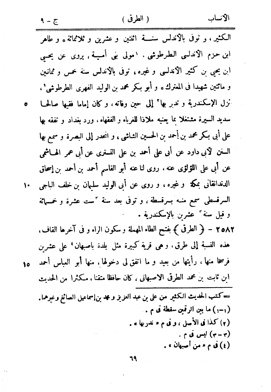 الكثير، وتوفى بالأندلس سنة اثنتين وعشرين وثلاثمائة وطاهر ابن حزم الأندلسى الطرطوشي، [1] مولى بنى أمية، يروى عن يحيى ابن يحيى بن كثير الأندلسى وغيره، توفى بالأندلس سنة خمس وثمانين ومائتين شهيدا في المعترك وأبو بكر محمد بن الوليد الفهري الطرطوشي [1] ، نزل الإسكندرية وتدبر بها [2] إلى حين وفاته، وكان إماما فقيها صالحا سديد السيرة مشتغلا بما يعنيه ملاذا للغرباء والفقهاء ورد بغداد وتفقه بها على أبى بكر محمد بن أحمد بن الحسين الشاشي، وانحدر إلى البصرة وسمع بها السنن لأبى داود عن أبى على أحمد بن على التستري عن أبى عمر الهاشمي عن أبى على اللؤلؤي عنه، روى لنا عنه أبو القاسم أحمد بن أحمد بن إسحاق الدندانقانى بمكة وغيره، وروى عن أبى الوليد سليمان بن خلف الباجي السرقسطي سمع منه بسرقسطة، وتوفى بعد سنة [3] ست عشرة وخمسمائة وقيل سنة [3] عشرين بالإسكندرية.