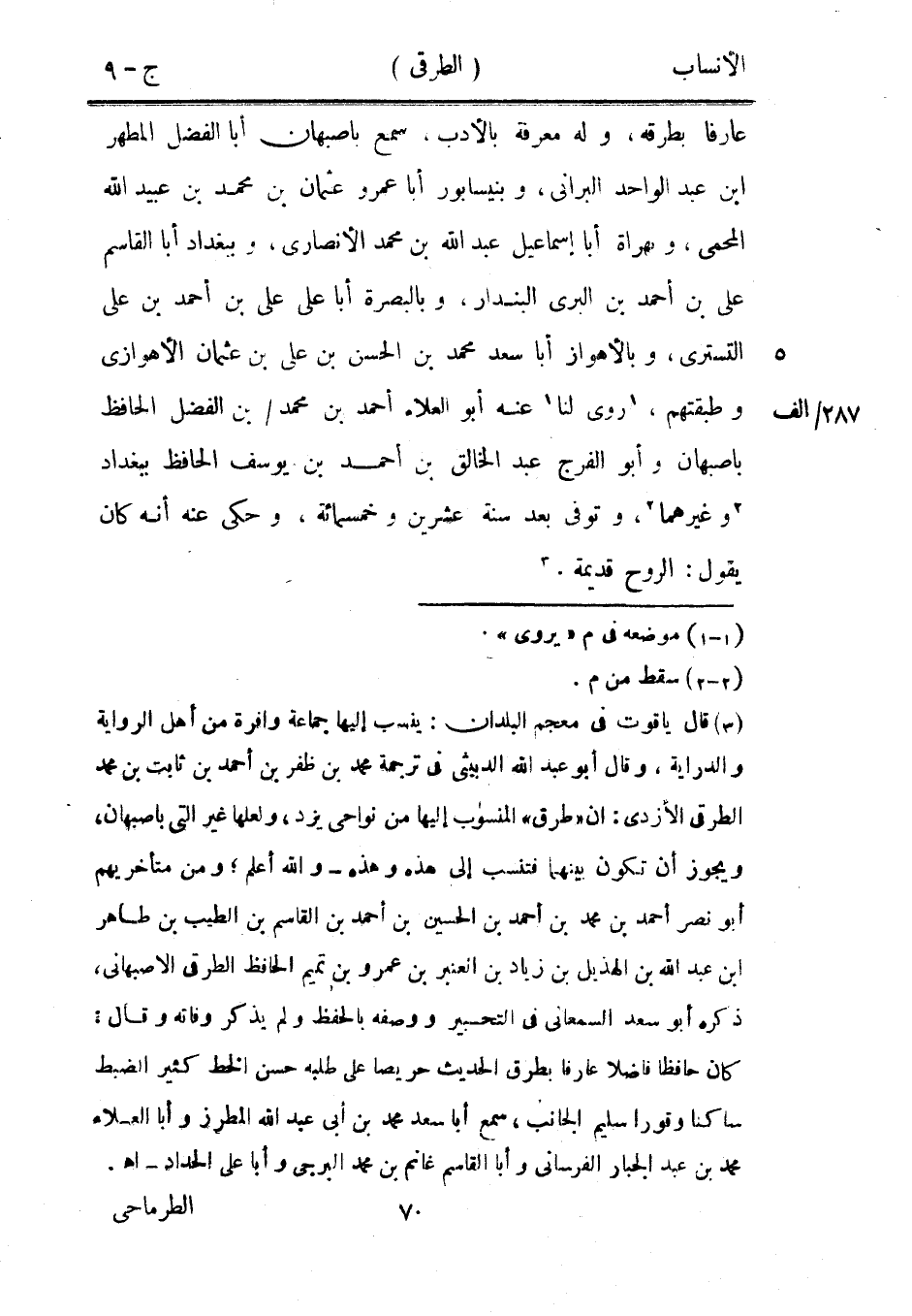 [3] قال ياقوت في معجم البلدان: ينسب إليها جماعة وافرة من أهل الرواية والدراية، وقال أبو عبد الله الدبيثى في ترجمة محمد بن ظفر بن أحمد بن ثابت بن محمد الطرقى الأزدي: ان «طرق» المنسوب إليها من نواحي يزد، ولعلها غير التي بأصبهان، ويجوز أن تكون بينهما فتنسب إلى هذه وهذه- والله أعلم، ومن متأخريهم أبو نصر أحمد بن محمد بن أحمد بن الحسين بن أحمد بن القاسم بن الطيب بن طاهر ابن عبد الله بن الهذيل بن زياد بن العنبر بن عمرو بن تميم الحافظ الطرقى الأصبهاني، ذكره أبو سعد السمعاني في التحير ووصفه بالحفظ ولم يذكر وفاته وقال: