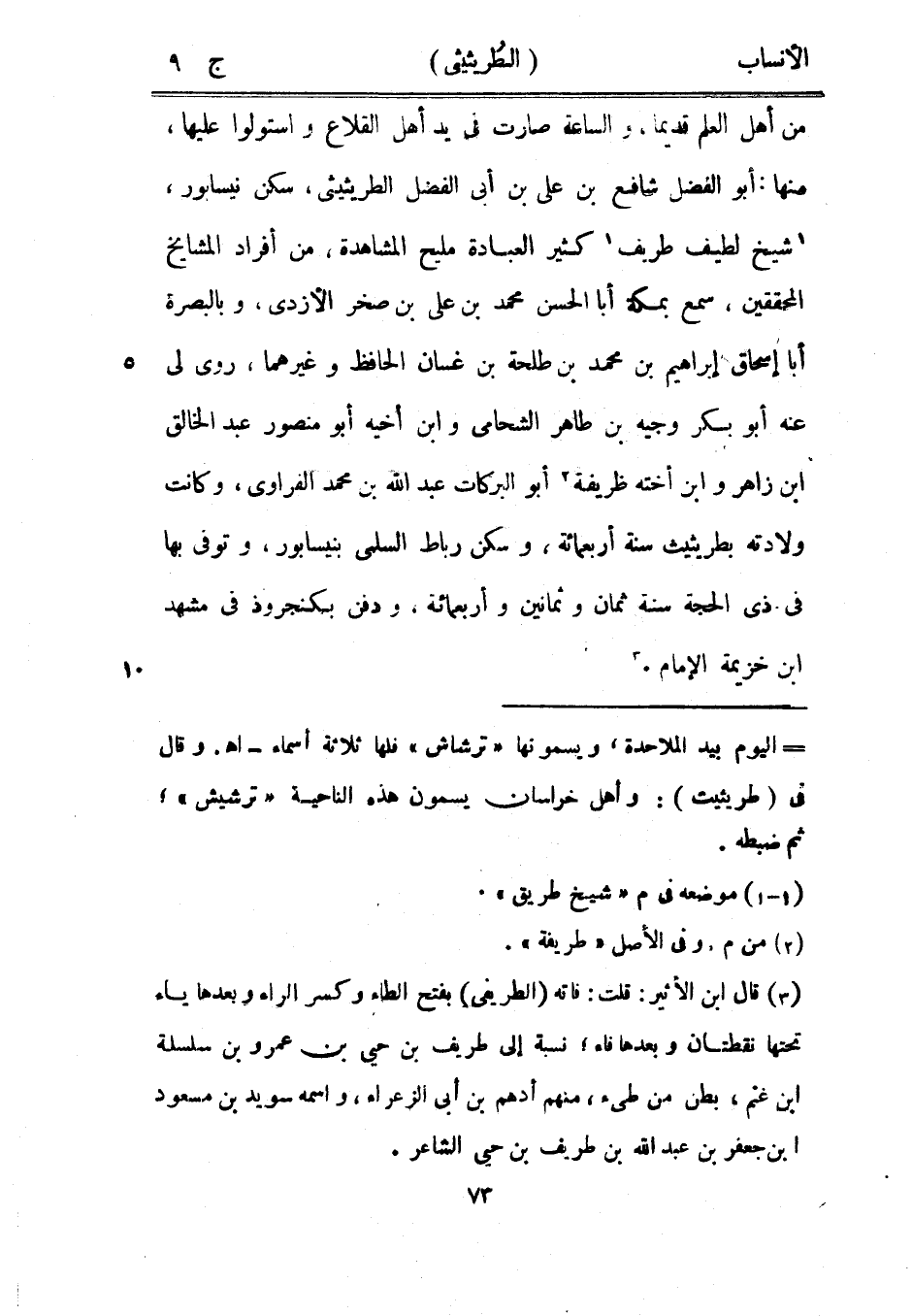 [3] قال ابن الأثير: قلت: فاته (الطريفي) بفتح الطاء وكسر الراء وبعدها ياء تحتها نقطتان وبعدها فاء، نسبة إلى طريف بن حيي بن عمرو بن سلسلة ابن غنم، بطن من طيِّئ، منهم أدهم بن أبى الزعراء، واسمه سويد بن مسعود ابن جعفر بن عبد الله بن طريف بن حيي الشاعر.