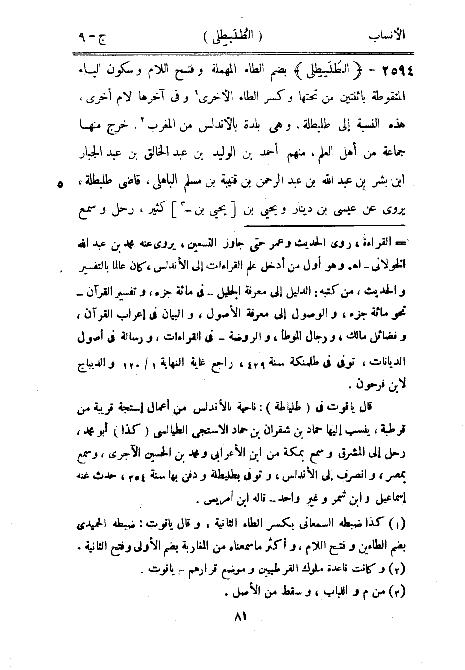 [1] كذا ضبطه السمعاني بكسر الطاء الثانية، وقال ياقوت: ضبطه الحميدي بضم الطاءين وفتح اللام، وأكثر ما سمعناه من المغاربة بضم الأولى وفتح الثانية.
