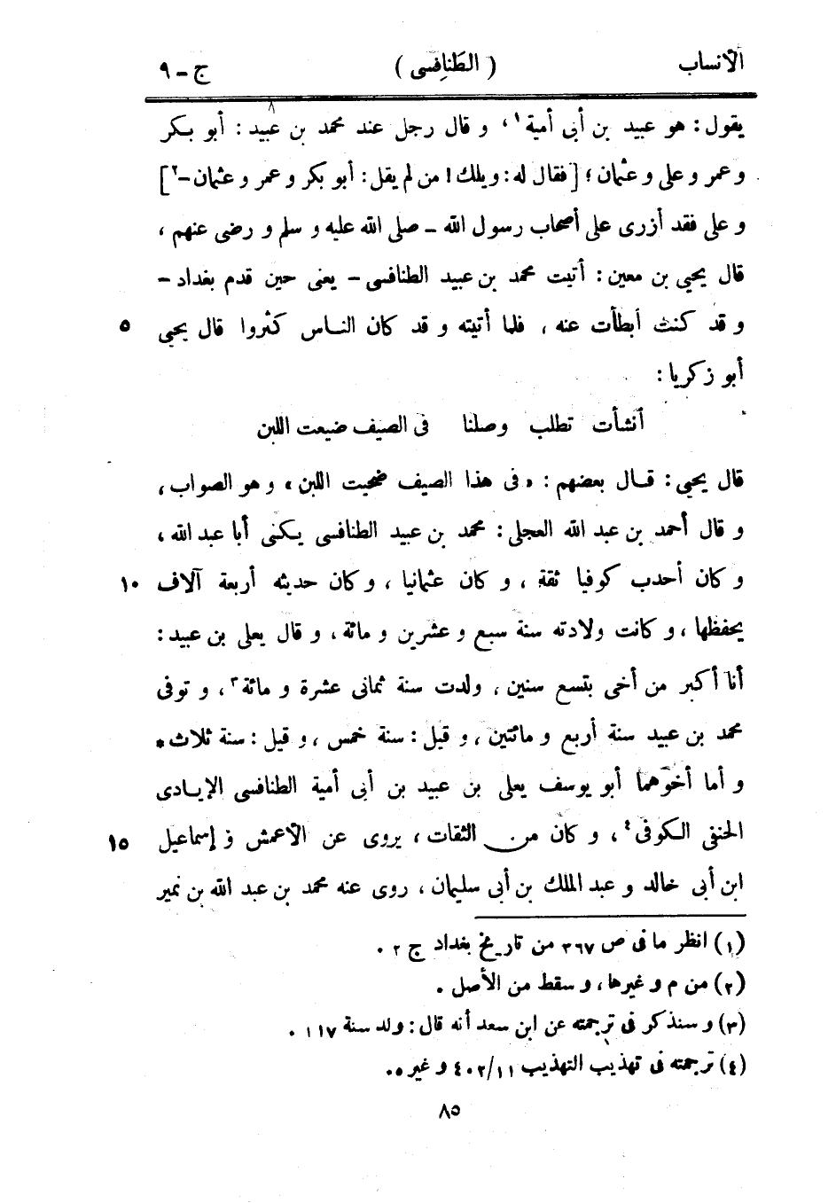 قال يحيى: قال بعضهم: «في هذا الصيف ضحيت اللبن» وهو الصواب، وقال أحمد بن عبد الله العجليّ: محمد بن عبيد الطنافسي يكنى أبا عبد الله، وكان أحدب كوفيا ثقة، وكان عثمانيا، وكان حديثه أربعة آلاف يحفظها، وكانت ولادته سنة سبع وعشرين ومائة، وقال يعلى بن عبيد: