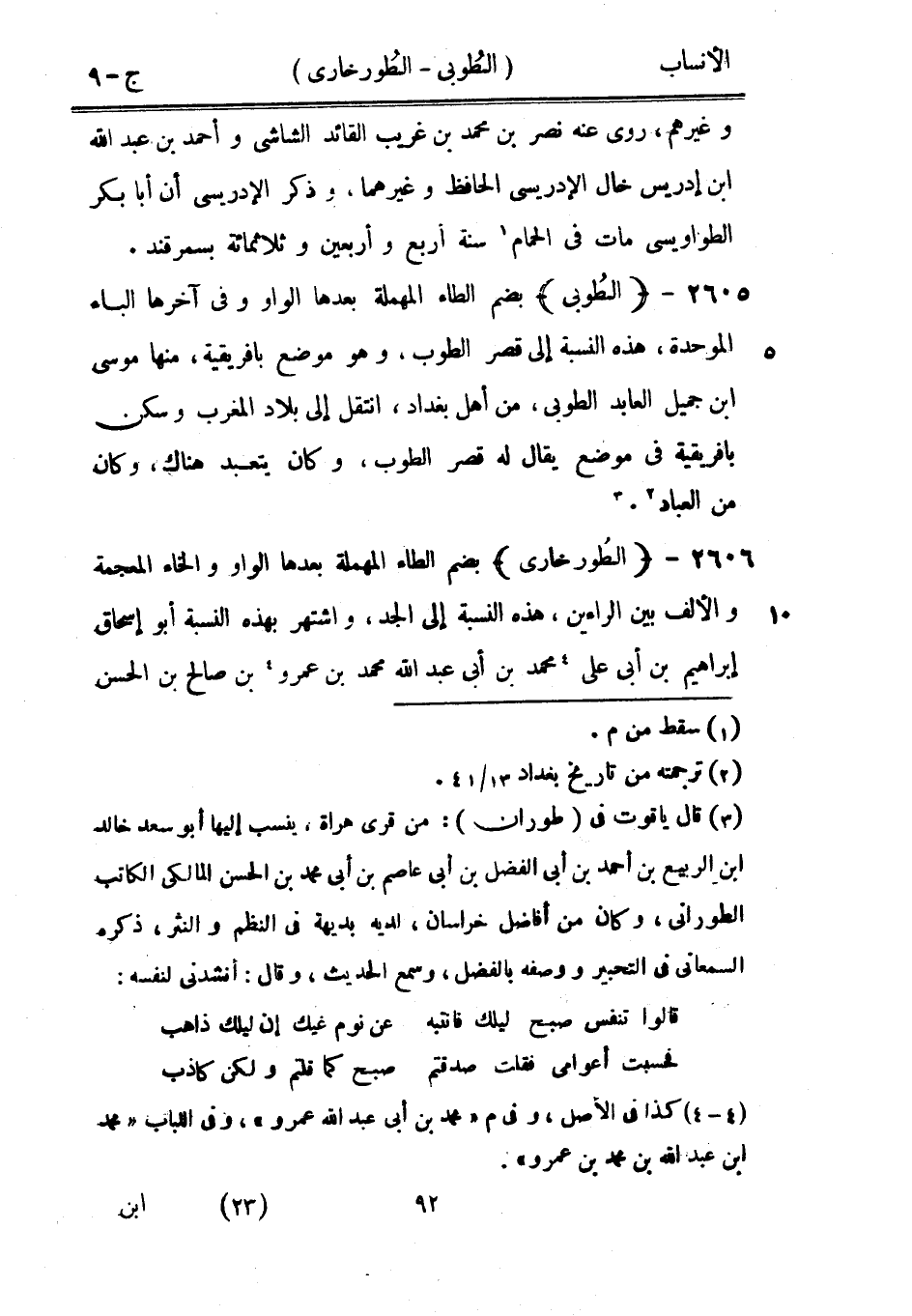 [3] قال ياقوت في (طوران) : من قرى هراة، ينسب إليها أبو سعد خالد ابن الربيع بن أحمد بن أبى الفضل بن أبى عاصم بن أبى محمد بن الحسن المالكي الكاتب الطوراني، وكان من أفاضل خراسان، لديه بديهة في النظم والنثر، ذكره السمعاني في التحبير ووصفه بالفضل، وسمع الحديث، وقال: أنشدنى لنفسه: