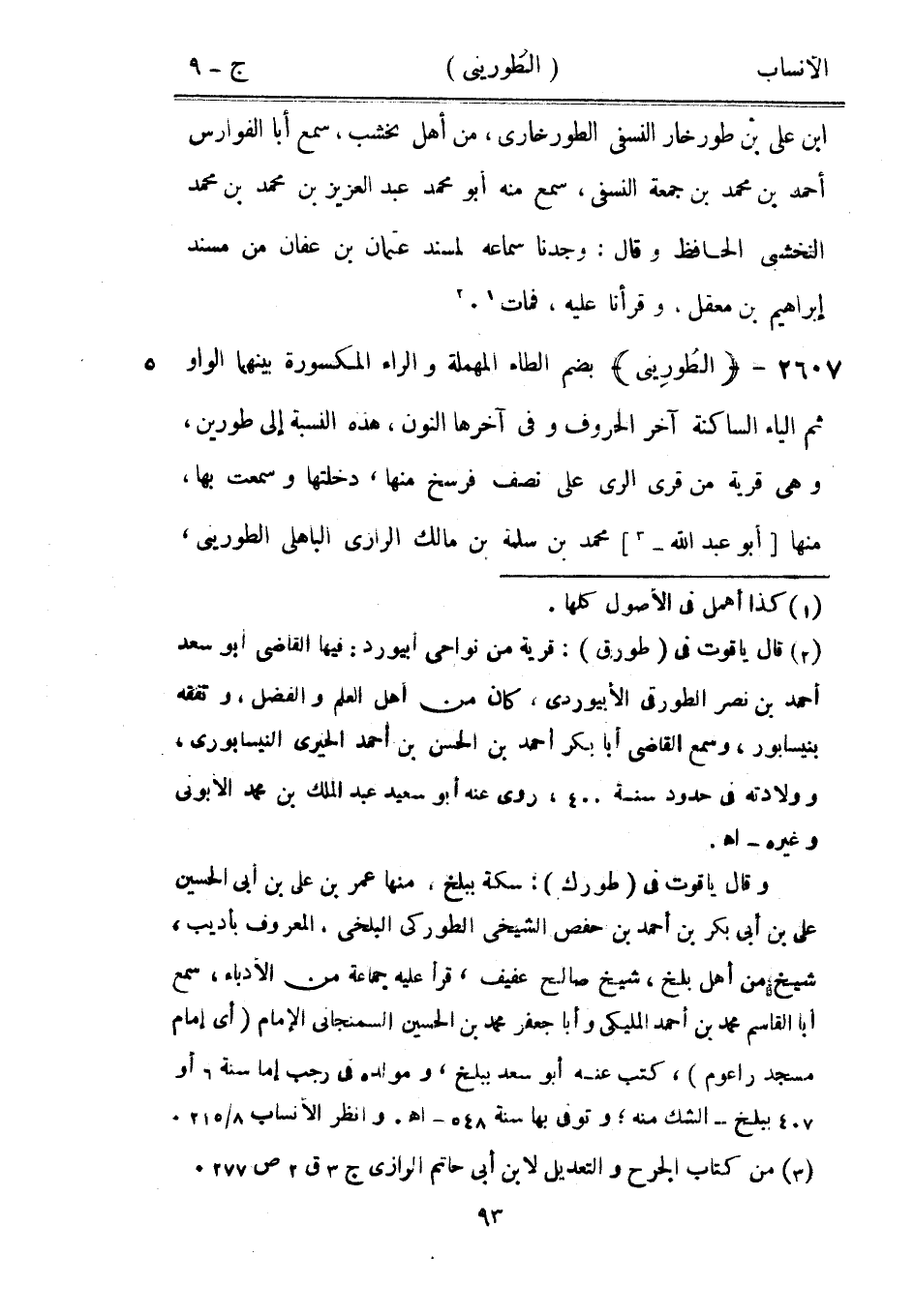 [2] قال ياقوت في (طورق) : قرية من نواحي أبيورد: فيها القاضي أبو سعد أحمد بن نصر الطورقى الأبيوردي، كان من أهل العلم والفضل، وتفقه بنيسابور، وسمع القاضي أبا بكر أحمد بن الحسن بن أحمد الحيريّ النيسابورىّ، وولادته في حدود سنة 400، روى عنه أبو سعيد عبد الملك بن محمد الأبونى وغيره- انتهى.