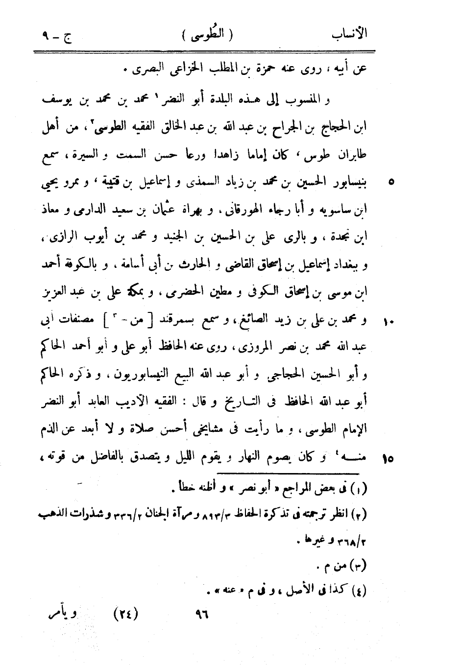 والمنسوب إلى هذه البلدة أبو النضر [1] محمد بن محمد بن يوسف ابن الحجاج بن الجراح بن عبد الله بن عبد الخالق الفقيه الطوسي [2] ، من أهل طابران طوس، كان إماما زاهدا ورعا حسن السمت والسيرة، سمع بنيسابور الحسين بن محمد بن زياد السمذى وإسماعيل بن قتيبة، وبمرو يحيى ابن ساسويه وأبا رجاء الهورقانى، وبهراة عثمان بن سعيد الدارميّ ومعاذ ابن نجدة، وبالري على بن الحسين بن الجنيد ومحمد بن أيوب الرازيّ، وببغداد إسماعيل بن إسحاق القاضي والحارث بن أبى أسامة، وبالكوفة أحمد ابن موسى بن إسحاق الكوفي ومطين الحضرميّ، وبمكة على بن عبد العزيز ومحمد بن على بن زيد الصائغ، وسمع بسمرقند [من-[3]] مصنفات أبى عبد الله محمد بن نصر المروزي، روى عنه الحافظ أبو على وأبو أحمد الحاكم وأبو الحسين الحجاجى وأبو عبد الله البيع النيسابوريون، وذكره الحاكم أبو عبد الله الحافظ في التاريخ وقال: الفقيه الأديب العابد أبو النضر الإمام الطوسي، وما رأيت في مشايخي أحسن صلاة ولا أبعد عن الذم منه [4] وكان يصوم النهار ويقوم الليل ويتصدق بالفاضل من قوته،