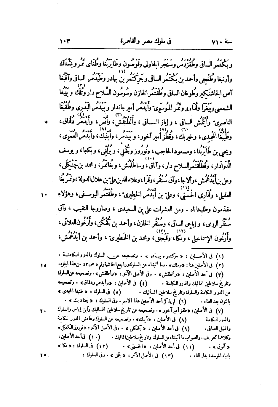 وبكتمر الساقى وطقزدمر وسنجر الجاولى وقوصون وطايربغا وطغاى تمر وبشتاك وأرنبغا وطغجى وأحمد بن بكتمر الساقى وجركتمر بن «1» بهادر وطيدمر الساقى وآقبغا آص الجاشنكير وطوغان الساقى وطقتمر الخازن وسوسون السّلاح دار وتلك «2» وبيبغا الشمسى وبيغرا وقمارى وتمر الموسوىّ وأيدمر أمير جاندار وبيدمر البدرى وطقبغا الناصرىّ وأيتمش الساقى، وإياز الساقى، وألطنقش «3» ، وأنس، وأيدمر «4» دقماق، وطيبغا «5» المجدى، وخير بك «6» ، وقطز «7» أمير آخور، وبيدمر، وأينبك «8» ، وأيدمر العمرى، ويحيى بن طايربغا، ومسعود الحاجب، ونوروز وكجلى، «9» وبرلغى، وبكجا، ويوسف الدّوادار، وقطلقتمر السلاح دار، وآناق «10» ، وساطلمش، وبغاتمر، ومحمد بن چنكلى، وعلى بن أيدغمش، وألاجا، وآق سنقر، وقرا، وعلاء الدين علىّ بن هلال الدولة، وتمربغا العقيلى، وقمارى الحسنى «11» ، وعلىّ بن أيدمر الخطيرىّ، وطقتمر اليوسفى، وهؤلاء مقدّمون وطلبخاناه. ومن العشرات على بن السعيدى، وصاروجا النقيب، وآق سنقر الرومى، وإياجى الساقى، وسنقر الخازن، وأحمد بن كجكن، وأرغون العلائى، وأرغون الإسماعيلى، وتكا «12» ، وقبجق «13» ، ومحمد بن الخطيرىّ، وأحمد بن أيدغمش،