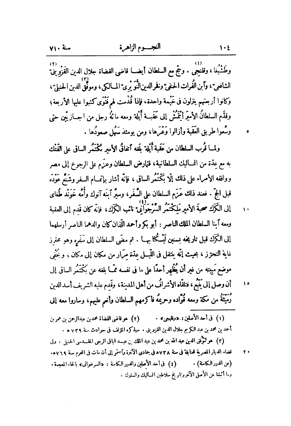 ولما قرب السلطان من عقبة أيلة بلغه اتفاق الأمير بكتمر الساقى على الفتك به مع عدّة من المماليك السلطانية، فتمارض السلطان وعزم على الرجوع إلى مصر ووافقه الأمراء على ذلك إلّا بكتمر الساقى، فإنّه أشار بإتمام السفر وشنّع عوده قبل الحجّ. فعند ذلك عزم السلطان على السّفر، وسيّر ابنه آنوك وأمّه خوند طغاى إلى الكرك صحبة الأمير ملكتمر السّرجوانىّ «4» نائب الكرك، فإنّه كان قدم إلى العقبة ومعه ابنا السلطان الملك الناصر: أبو بكر وأحمد اللّذان كان والدهما الناصر أرسلهما إلى الكرك قبل تاريخه بسنين ليسكنا بها. ثم مضى السلطان إلى سفره وهو محترز غاية التحرّز، بحيث إنّه ينتقل فى اللّيل عدّة مرار من مكان إلى مكان؛ ويحفى موضع مبيته من غير أن يظهر أحدا على ما فى نفسه ممّا بلغه عن بكتمر الساقى إلى أن وصل إلى ينبع، فتلقّاه الأشراف من أهل المدينة، وقدم عليه الشريف أسد الدين رميثة من مكة ومعه قوّاده وحريمه فأكرمهم السلطان وأنعم عليهم، وساروا معه إلى