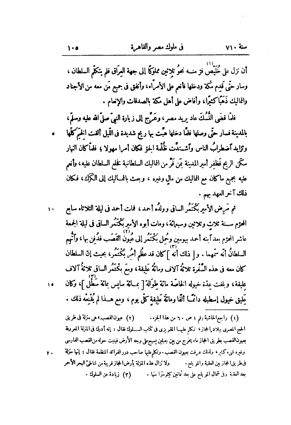 ثم مرض الأمير بكتمر الساقى وولده أحمد، فمات أحمد فى ليلة الثلاثاء سابع المحرّم سنة ثلاث وثلاثين وسبعمائة، ومات أبوه الأمير بكتمر الساقى فى ليلة الجمعة عاشر المحرّم بعد ابنه أحمد بيومين وحمل بكتمر إلى عيون «2» القصب فدفن بها، واتّهم السلطان أنّه سمّهما. و [ذلك أنه «3» ] كان قد عظم أمر بكتمر، بحيث إنّ السلطان كان معه فى هذه السّفرة ثلاثة آلاف ومائة عليقة، ومع بكتمر الساقى ثلاثة آلاف عليقة، وبلغت عدّة خيوله الخاصّة مائة طوالة [بمائة سايس بمائة سطل «4» ] ، وكان عليق خيول إسطبله دائما ألفا ومائة عليقة كلّ يوم، ومع هذا لم يقنعه ذلك.