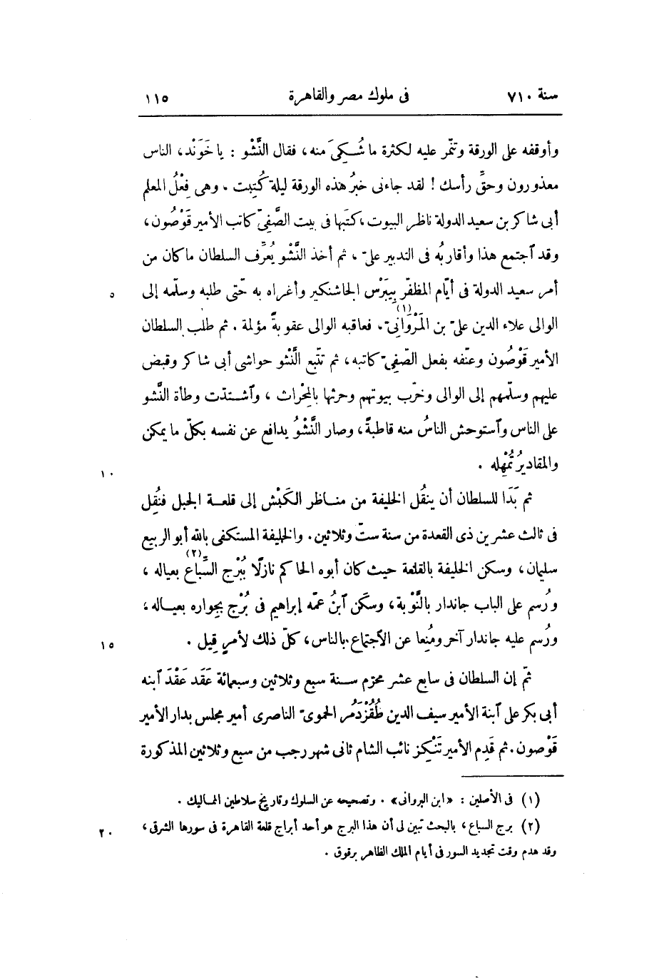 وأوقفه على الورقة وتنّمر عليه لكثرة ما شكى منه، فقال النّشو: يا خوند، الناس معذورون وحقّ رأسك! لقد جاءنى خبر هذه الورقة ليلة كتبت، وهى فعل المعلم أبى شاكر بن سعيد الدولة ناظر البيوت، كتبها فى بيت الصّفىّ كاتب الأمير قوصون، وقد اجتمع هذا وأقاربه فى التدبير علىّ، ثم أخذ النّشو يعرّف السلطان ما كان من أمر سعيد الدولة فى أيّام المظفّر بيبرس الجاشنكير وأغراه به حتّى طلبه وسلّمه إلى الوالى علاء الدين علىّ بن المروانىّ «1» ، فعاقبه الوالى عقوبة مؤلمة. ثم طلب السلطان الأمير قوصون وعنّفه بفعل الصّفىّ كاتبه، ثم تتّبع النّشو حواشى أبى شاكر وقبض عليهم وسلّمهم إلى الوالى وخرّب بيوتهم وحرثها بالمحراث، واشتدّت وطأة النّشو على الناس واستوحش الناس منه قاطبة، وصار النّشو يدافع عن نفسه بكلّ ما يمكن والمقادير تمهله.
