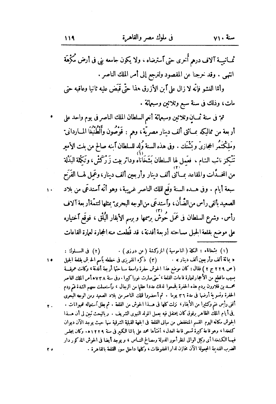 ثمّ فى سنة ثمان وثلاثين وسبعمائة أنعم السلطان الملك الناصر فى يوم واحد على أربعة من مماليكه بمائتى ألف دينار مصريّة، وهم: قوصون وألطنبغا الماردانىّ وملكتمر الحجازىّ وبشتك. وفى هذه السنة ولد للسلطان ابنه صالح من بنت الأمير تنكز نائب الشام، فعمل لها السلطان بشخاناه «1» ودائر بيت زركش، وتكملة البذلة من المخدّات والمقاعد بمائتى «2» ألف دينار وأربعين ألف دينار، وعمل لها الفرخ سبعة أيام. وفى هذه السنة وقع للملك الناصر غريبة، وهو أنّه استدعى من بلاد الصعيد بألفى رأس من الضّأن، واستدعى من الوجه البحرىّ بمثلها لتتمّة أربعة آلاف رأس. وشرع السلطان فى عمل حوش «3» برسمها وبرسم الأبقار البلق، فوقع اختياره على موضع بقلعة الجبل مساحته أربعة أفدنة، قد قطعت منه الحجارة لعمارة القاعات
