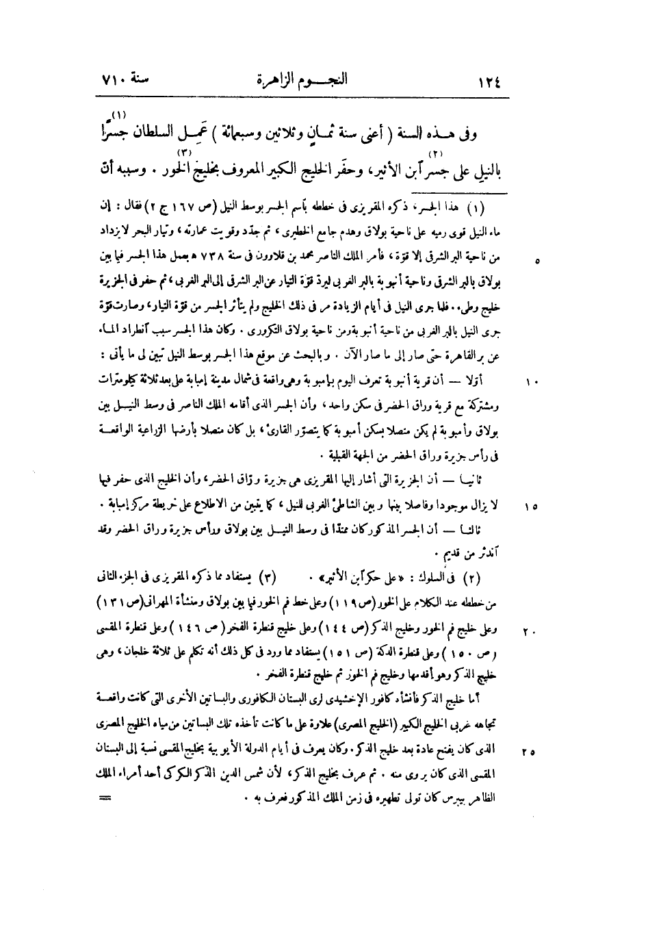 وفى هذه السنة (أعنى سنة ثمان وثلاثين وسبعمائة) عمل السلطان جسرا «1» بالنيل على جسر «2» ابن الأثير، وحفر الخليج الكبير المعروف بخليج الخور «3» . وسببه أنّ