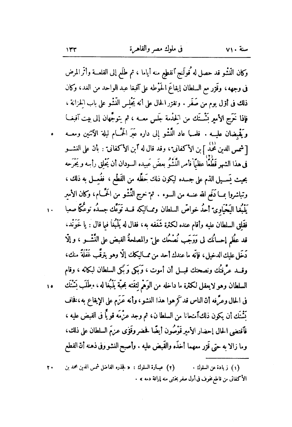 وكان النّشو قد حصل له قولنج انقطع منه أياما، ثم طلع إلى القلعة وأثر المرض فى وجهه، وقرّر مع السلطان إيقاع الحوطه على آقبغا عبد الواحد من الغد، وكان ذلك فى أوّل يوم من صفر. وتقرّر الحال على أنه يجلس النّشو على باب الخزانة، فإذا خرج الأمير بشتك من الخدمة جلس معه، ثم يتوجّهان إلى بيت آقبغا ويقبضان عليه. فلما عاد النّشو إلى داره عبر الحمّام ليلة الاثنين ومعه [شمس الدين محمد «1» ] بن الأكفانىّ، وقد قال له ابن الأكفانىّ: بأنّ على النشو فى هذا الشهر قطعا «2» عظيما فأمر النّشو بعض عبيده السودان أن يحلق رأسه ويجرحه بحيث يسيل الدّم على جسده ليكون ذلك حظّه من القطع، ففعل به ذلك، وتباشروا بما دفع الله عنه من السوء. ثمّ خرج النّشو من الحمّام، وكان الأمير يلبغا اليحياوىّ أحد خواصّ السلطان ومماليكه قد توعّك جسده توعّكا صعبا فقلق السلطان عليه وأقام عنده لكثرة شغفه به، فقال له يلبغا فيما قال: ياخوند، قد عظم إحسانك لى ووجب نصحك علىّ والمصلحة القبض على النّشو، وإلّا دخل عليك الدخيل، فإنّه ما عندك أحد من مماليكك إلّا وهو يترقّب غفلة منك، وقد عرّفتك ونصحتك قبل أن أموت، وبكى وبكى السلطان لبكائه، وقام السلطان وهو لا يعقل لكثرة ما داخله من الوهم لثقته بمحبّة يلبغا له، وطلب بشتك فى الحال وعرّفه أنّ الناس قد كرهوا هذا النشو، وأنه عزم على الإيقاع به، فخاف بشتك أن يكون ذلك امتحانا من السلطان، ثم وجد عزمه قويّا فى القبض عليه، فاقتضى الحال إحضار الأمير قوصون أيضا فحضر وقوّى عزم السلطان على ذلك، وما زالا به حتى قرّر معهما أخذه والقبض عليه. وأصبح النشو وفى ذهنه أنّ القطع
