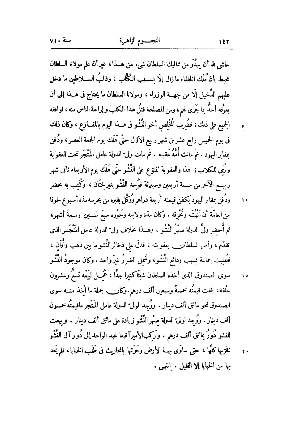 حاشى لله أنّ يبدو من مماليك السلطان شىء من هذا، غير أنّ علم مولانا السلطان محيط بأنّ ملك الخلفاء ما زال إلّا بسبب الكتّاب، وغالب السلاطين ما دخل عليهم الدّخيل إلّا من جهة الوزراء، ومولانا السلطان ما يحتاج فى هذا إلى أن يعرّفه أحد بما جرى لهم، ومن المصلحة قتل هذا الكلب وإراحة الناس منه، فوافقه الجميع على ذلك، فضرب المخلص أخو النّشو فى هذا اليوم بالمقارع، وكان ذلك فى يوم الخميس رابع عشرين شهر ربيع الأوّل حتّى هلك يوم الجمعة العصر، ودفن بمقابر اليهود. ثمّ ماتت أمّه عقيبه. ثم مات ولىّ الدولة عامل المتجر تحت العقوبة ورمى للكلاب؛ هذا والعقوبة تتنوّع على النّشو حتّى هلك يوم الأربعاء ثانى شهر ربيع الآخر من سنة أربعين وسبعمائة فوجد النّشو بغير ختان، وكتب به محضر ودفن بمقابر اليهود بكفن قيمته أربعة دراهم ووكّل بقبره من يحرسه مدّة أسبوع خوفا من العامّة أن تنبشه وتحرقه. وكان مدّة ولايته وجوره سبع سنين وسبعة أشهر، ثم أحضر ولىّ الدولة صهر النّشو، وهذا بخلاف ولىّ الدولة عامل المتجر الذي تقدّم، وأمر السلطان بعقوبته، فدلّ على ذخائر النّشو ما بين ذهب وأوان، فطلبت جماعة بسبب ودائع النّشو، وشمل الضرر غير واحد. وكان موجود النّشو سوى الصندوق الذي أخذه السلطان شيئا كثيرا جدّا، عمل لبيعه تسع وعشرون حلقة، بلغت قيمته خمسة وسبعين ألف درهم. وكان جملة ما أخذ منه سوى الصندوق نحو مائتى ألف دينار. ووجد لولىّ الدولة عامل المتجر ما قيمته خمسون ألف دينار. ووجد لولىّ الدولة صهر النّشو زيادة على مائتى ألف دينار. وبيعت للنشو دور بمائتى ألف درهم. وركب الأمير آقبغا عبد الواحد إلى دور آل النّشو فخرّبها كلّها، حتى ساوى بها الأرض وحرثها بالمحاريث فى طلب الخبايا، فلم يجد بها من الخبايا إلا القليل. انتهى.