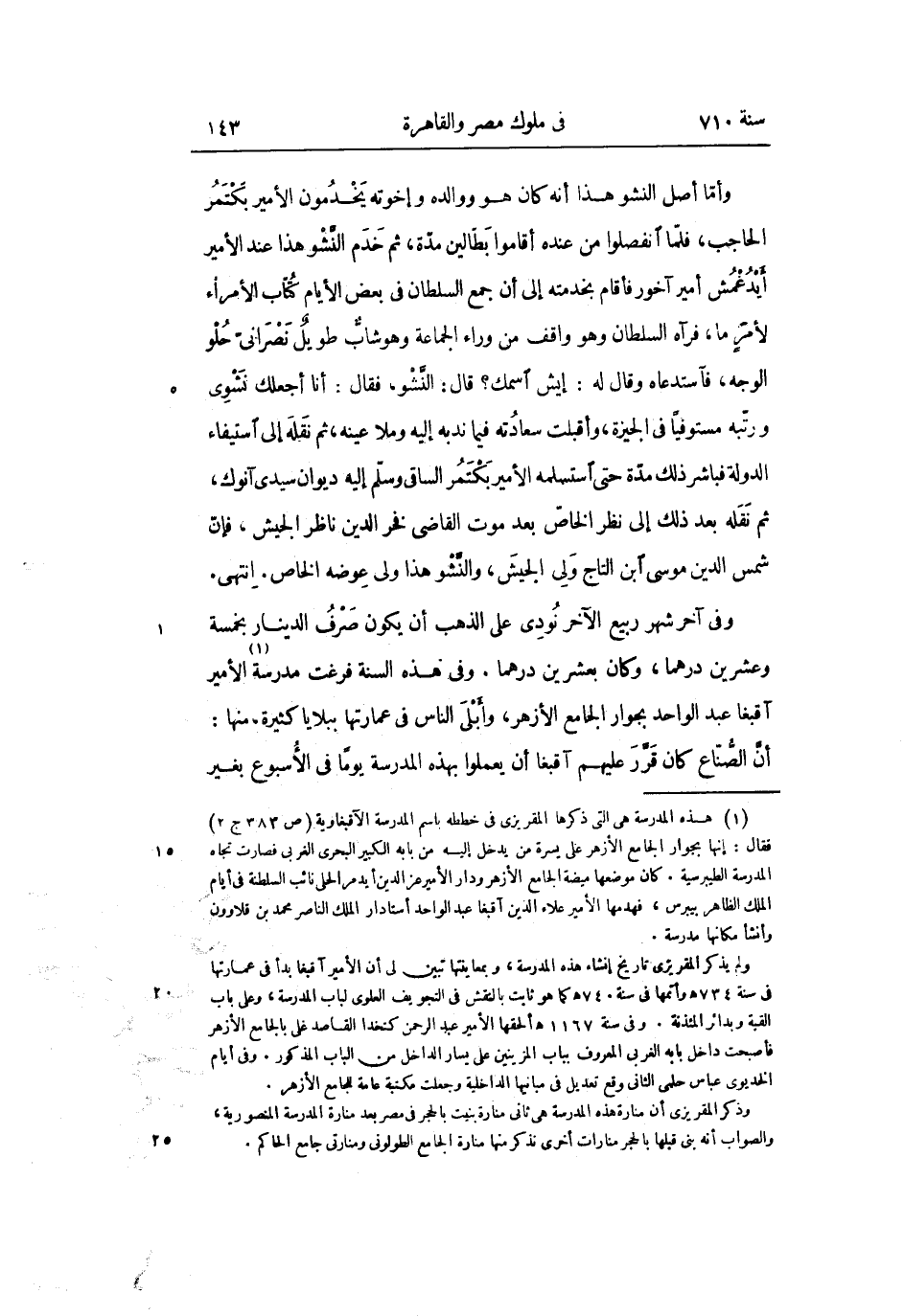 وفى آخر شهر ربيع الآخر نودى على الذهب أن يكون صرف الدينار بخمسة وعشرين درهما، وكان بعشرين درهما. وفى هذه السنة فرغت مدرسة «1» الأمير آقبغا عبد الواحد بجوار الجامع الأزهر، وأبلى الناس فى عمارتها ببلايا كثيرة، منها: