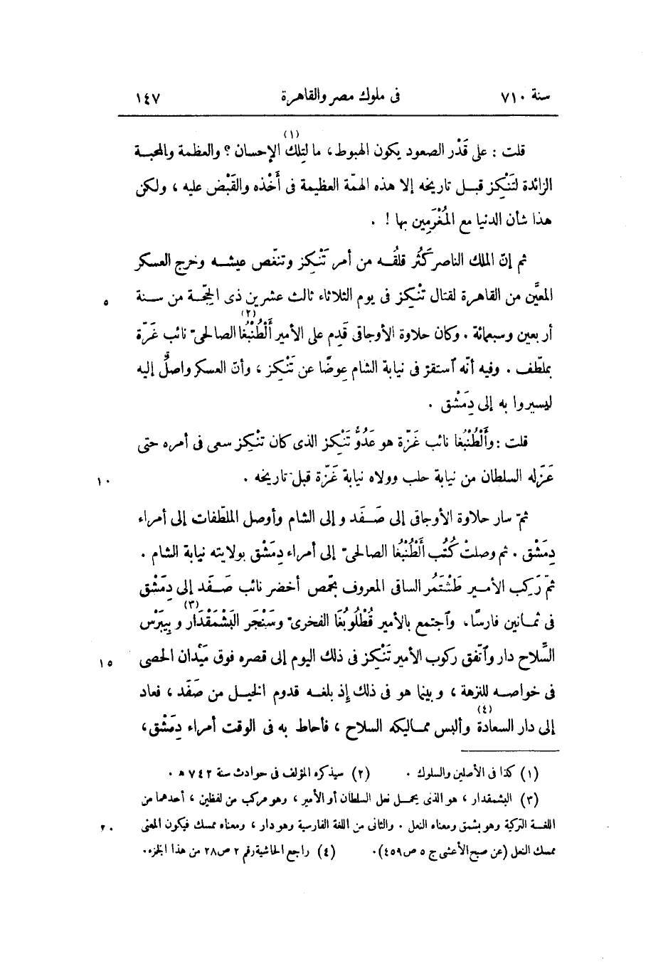 ثم ركب الأمير طشتمر الساقى المعروف بحمّص أخضر نائب صفد إلى دمشق فى ثمانين فارسا، واجتمع بالأمير قطلوبغا الفخرىّ وسنجر البشمقدار «3» وبيبرس السّلاح دار واتّفق ركوب الأمير تنكز فى ذلك اليوم إلى قصره فوق ميدان الحصى فى خواصه للنزهة، وبينما هو فى ذلك إذ بلغه قدوم الخيل من صفد، فعاد إلى دار السعادة «4» وألبس مماليكه السلاح، فأحاط به فى الوقت أمراء دمشق،