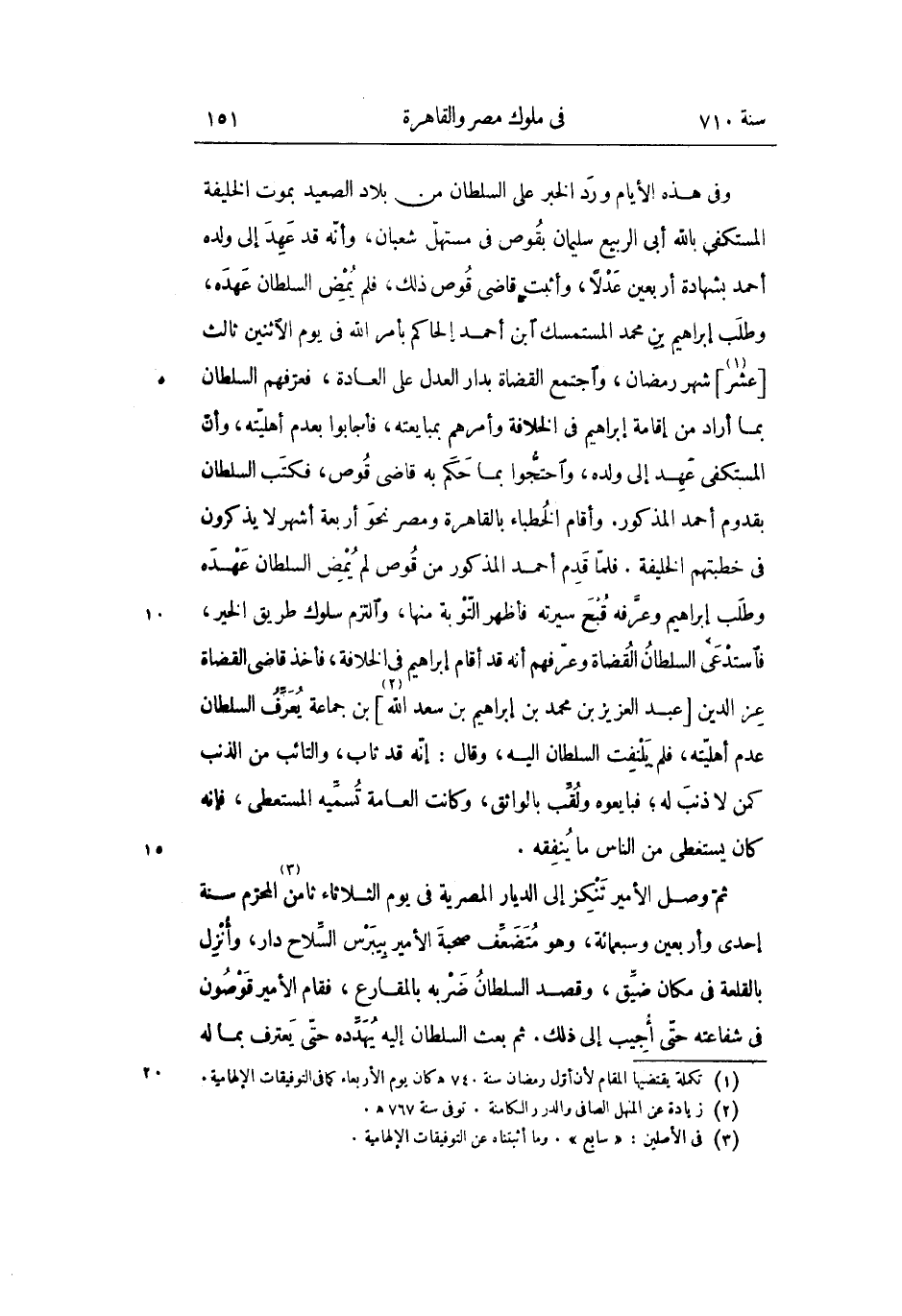 وفى هذه الأيام ورد الخبر على السلطان من بلاد الصعيد بموت الخليفة المستكفى بالله أبى الربيع سليمان بقوص فى مستهلّ شعبان، وأنّه قد عهد إلى ولده أحمد بشهادة أربعين عدلا، وأثبت قاضى قوص ذلك، فلم يمض السلطان عهده، وطلب إبراهيم بن محمد المستمسك ابن أحمد الحاكم بأمر الله فى يوم الاثنين ثالث [عشر «1» ] شهر رمضان، واجتمع القضاة بدار العدل على العادة، فعرّفهم السلطان بما أراد من إقامة إبراهيم فى الخلافة وأمرهم بمبايعته، فأجابوا بعدم أهليّته، وأنّ المستكفى عهد إلى ولده، واحتجّوا بما حكم به قاضى قوص، فكتب السلطان بقدوم أحمد المذكور. وأقام الخطباء بالقاهرة ومصر نحو أربعة أشهر لا يذكرون فى خطبتهم الخليفة. فلمّا قدم أحمد المذكور من قوص لم يمض السلطان عهده وطلب إبراهيم وعرّفه قبح سيرته فأظهر التّوبة منها، والتزم سلوك طريق الخير، فاستدعى السلطان القضاة وعرّفهم أنه قد أقام إبراهيم فى الخلافة، فأخذ قاضى القضاة عز الدين [عبد العزيز بن محمد بن إبراهيم بن سعد الله «2» ] بن جماعة يعرّف السلطان عدم أهليّته، فلم يلتفت السلطان اليه، وقال: إنّه قد ثاب، والتائب من الذنب كمن لا ذنب له؛ فبايعوه ولقّب بالواثق، وكانت العامة تسمّيه المستعطى، فإنه كان يستغطى من الناس ما ينفقه.