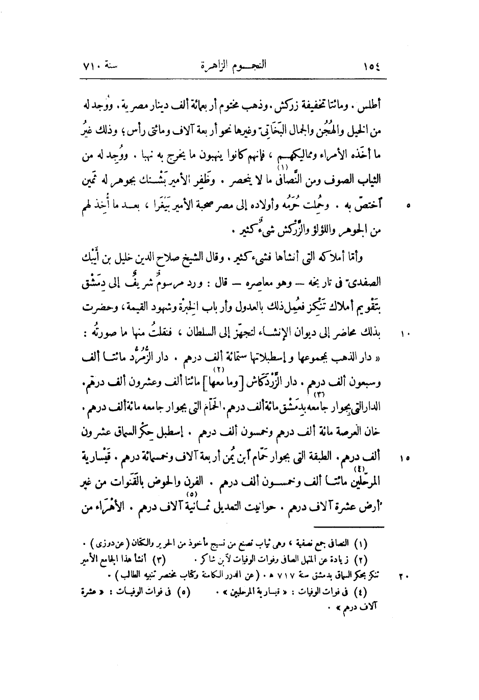 خان العرصة مائة ألف درهم وخمسون ألف درهم. إسطبل حكر السماق عشرون ألف درهم. الطبقة التى بجوار حمّام ابن يمن أربعة آلاف وخمسمائة درهم. قيسارية المرحّلين «4» مائتا ألف وخمسون ألف درهم. الفرن والحوض بالقنوات من غير أرض عشرة آلاف درهم. حوانيت التعديل ثمانية «5» آلاف درهم. الأهراء من
