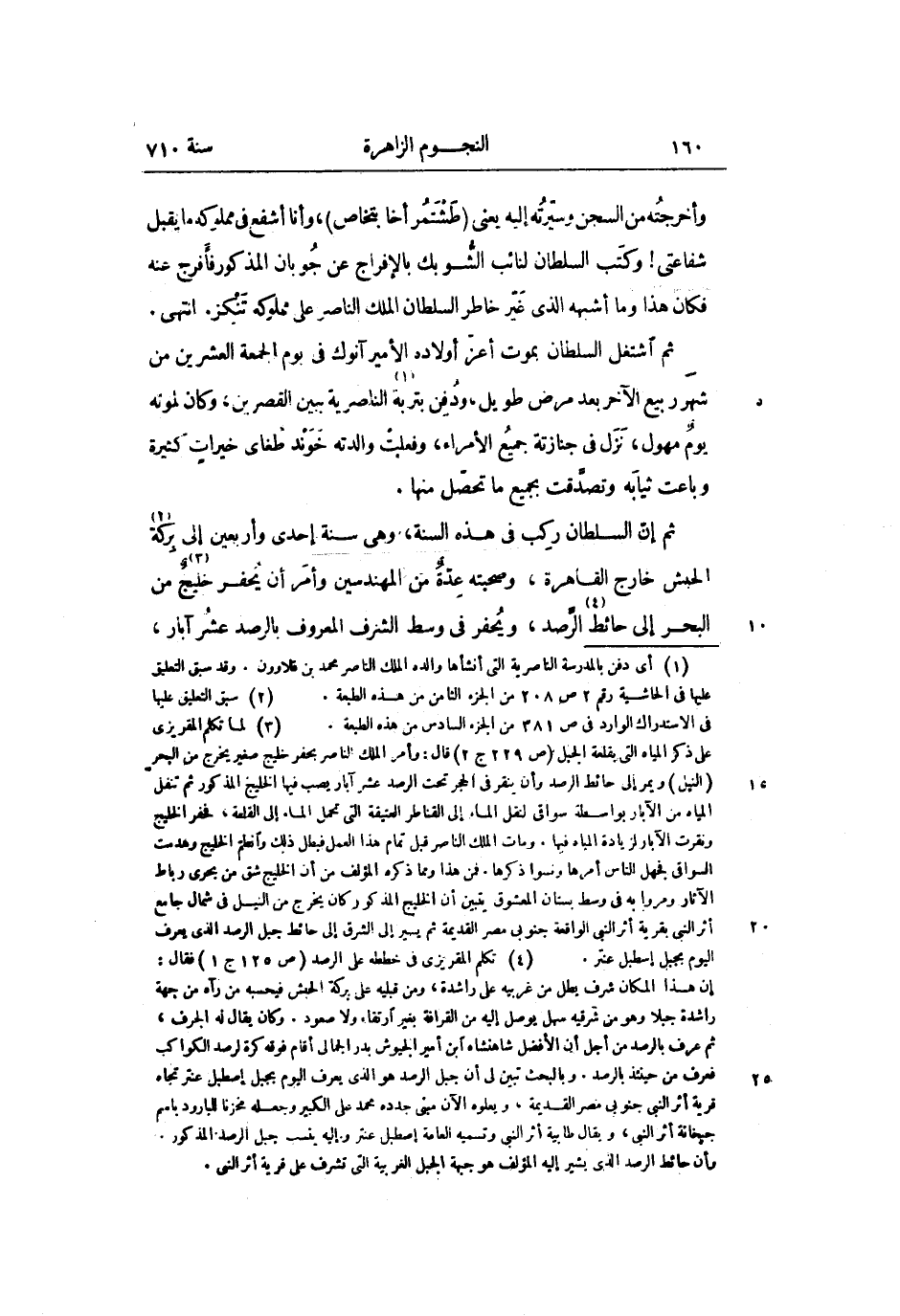 ثم إنّ السلطان ركب فى هذه السنة، وهى سنة إحدى وأربعين إلى بركة «2» الحبش خارج القاهرة، وصحبته عدّة من المهندسين وأمر أن يحفر خليج «3» من البحر إلى حائط «4» الرّصد، ويحفر فى وسط الشرف المعروف بالرصد عشر آبار،