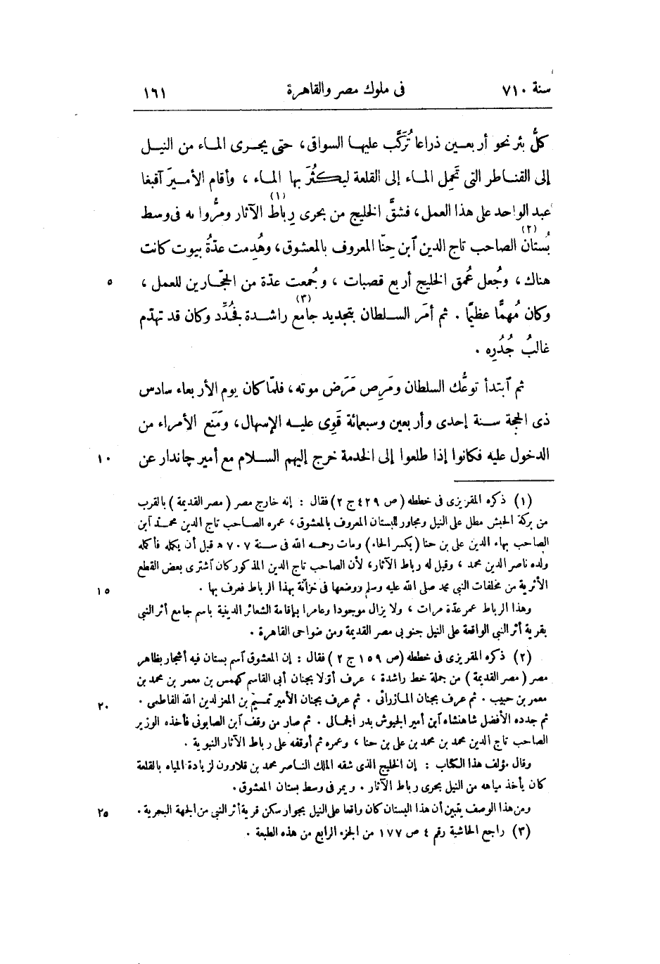 كلّ بئر نحو أربعين ذراعا تركّب عليها السواقى، حتى يجرى الماء من النيل إلى القناطر التى تحمل الماء إلى القلعة ليكثر بها الماء، وأقام الأمير آقبغا عبد الواحد على هذا العمل، فشقّ الخليج من بحرى رباط «1» الآثار ومرّوا به فى وسط بستان «2» الصاحب تاج الدين ابن حنّا المعروف بالمعشوق، وهدمت عدّة بيوت كانت هناك، وجعل عمق الخليج أربع قصبات، وجمعت عدّة من الحجّارين للعمل، وكان مهمّا عظيما. ثم أمر السلطان بتجديد جامع «3» راشدة فجدّد وكان قد تهدّم غالب جدره.