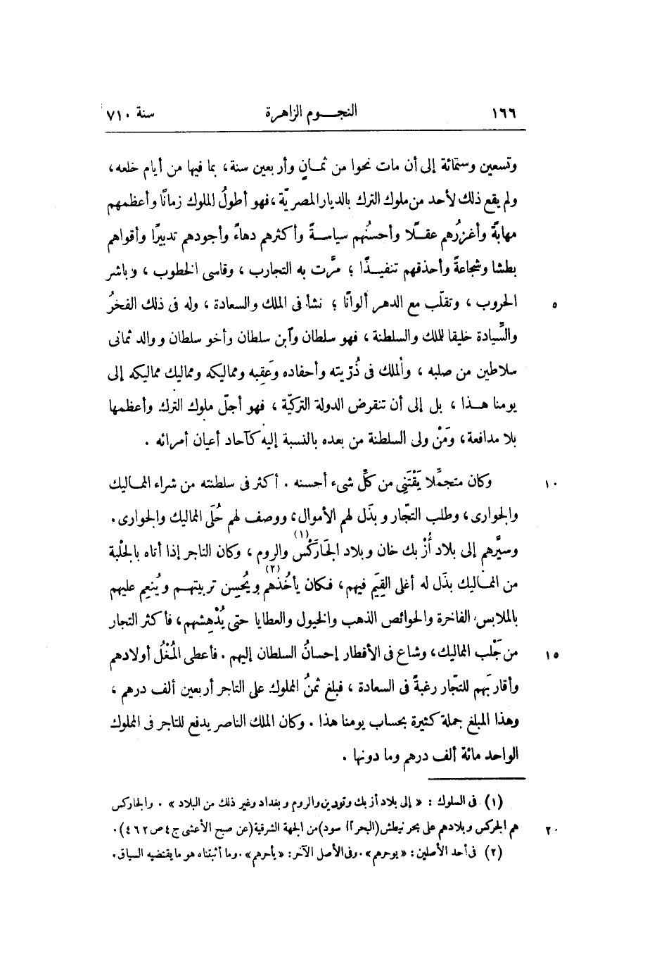 وتسعين وستمائة إلى أن مات نحوا من ثمان وأربعين سنة، بما فيها من أيام خلعه، ولم يقع ذلك لأحد من ملوك الترك بالديار المصريّة، فهو أطول الملوك زمانا وأعظمهم مهابة وأغزرهم عقلا وأحسنهم سياسة وأكثرهم دهاء وأجودهم تدبيرا وأقواهم بطشا وشجاعة وأحذقهم تنفيذا؛ مرّت به التجارب، وقاسى الخطوب، وباشر الحروب، وتقلّب مع الدهر ألوانا؛ نشأ فى الملك والسعادة، وله فى ذلك الفخر والسّيادة خليقا للملك والسلطنة، فهو سلطان وابن سلطان وأخو سلطان ووالد ثمانى سلاطين من صلبه، والملك فى ذرّيته وأحفاده وعقبه ومماليكه ومماليك مماليكه إلى يومنا هذا، بل إلى أن تنقرض الدولة التركيّة، فهو أجلّ ملوك الترك وأعظمها بلا مدافعة، ومن ولى السلطنة من بعده بالنسبة إليه كآحاد أعيان أمرائه.