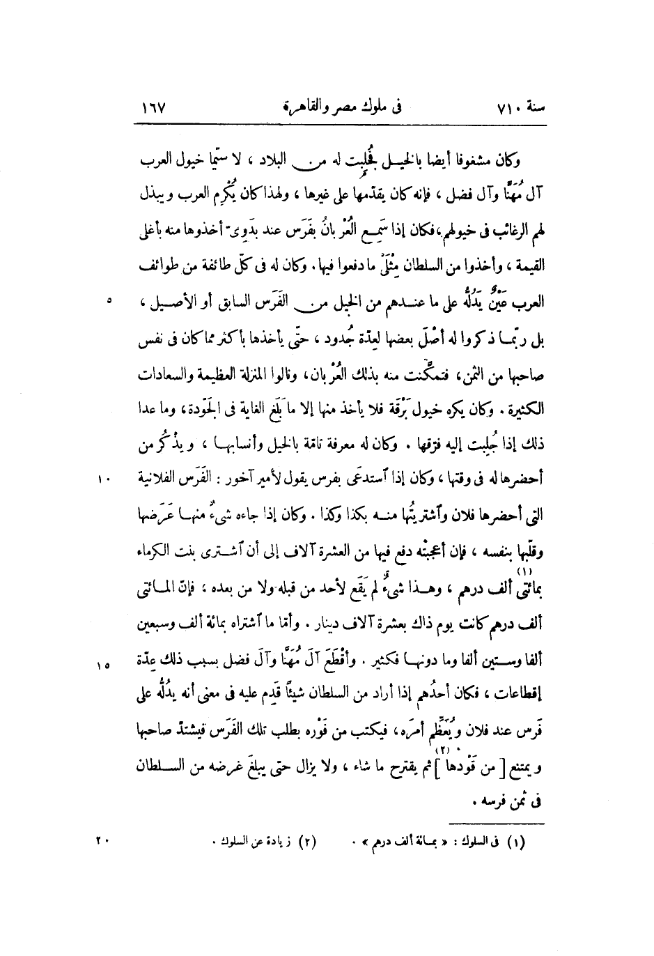 وكان مشغوفا أيضا بالخيل فجلبت له من البلاد، لا سيّما خيول العرب آل مهنّا وآل فضل، فإنه كان يقدّمها على غيرها، ولهذا كان يكرم العرب ويبذل لهم الرغائب فى خيولهم، فكان إذا سمع العربان بفرس عند بدوىّ أخذوها منه بأغلى القيمة، وأخذوا من السلطان مثلى ما دفعوا فيها. وكان له فى كلّ طائفة من طوائف العرب عين يدلّه على ما عندهم من الخيل من الفرس السابق أو الأصيل، بل ربّما ذكروا له أصل بعضها لعدّة جدود، حتّى يأخذها بأكثر مما كان فى نفس صاحبها من الثمن، فتمكّنت منه بذلك العربان، ونالوا المنزلة العظيمة والسعادات الكثيرة. وكان يكره خيول برقة فلا يأخذ منها إلا ما بلغ الغاية فى الجودة، وما عدا ذلك إذا جلبت إليه فرّقها. وكان له معرفة تامّة بالخيل وأنسابها، ويذكر من أحضرها له فى وقتها، وكان إذا استدعى بفرس يقول لأمير آخور: الفرس الفلانية التى أحضرها فلان واشتريتها منه بكذا وكذا. وكان إذا جاءه شىء منها عرضها وقلّبها بنفسه، فإن أعجبته دفع فيها من العشرة آلاف إلى أن اشترى بنت الكرماء بمائتى «1» ألف درهم، وهذا شىء لم يقع لأحد من قبله ولا من بعده، فإنّ المائتى ألف درهم كانت يوم ذاك بعشرة آلاف دينار. وأمّا ما اشتراه بمائة ألف وسبعين ألفا وستين ألفا وما دونها فكثير. وأقطع آل مهنّا وآل فضل بسبب ذلك عدّة إقطاعات، فكان أحدهم إذا أراد من السلطان شيئا قدم عليه فى معنى أنه يدلّه على فرس عند فلان ويعظّم أمره، فيكتب من فوره بطلب تلك الفرس فيشتدّ صاحبها ويمتنع [من قودها «2» ] ثم يقترح ما شاء، ولا يزال حتى يبلغ غرضه من السلطان فى ثمن فرسه.