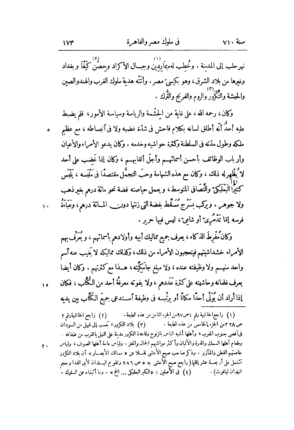 وكان، رحمه الله، على غاية من الحشمة والرياسة وسياسة الأمور، فلم يضبط عليه أحد أنّه أطلق لسانه بكلام فاحش فى شدّة غضبه ولا فى انبساطه، مع عظيم ملكه وطول مدّته فى السلطنة وكثرة حواشيه وخدمه. وكان يدعو الأمراء والأعيان وأرباب الوظائف بأحسن أسمائهم وأجلّ ألقابهم، وكان إذا غضب على أحد لا يظهر له ذلك، وكان مع هذه الشهامة وحبّ التجمّل مقتصدا فى ملبسه، يلبس كثيرا «4» البعلبكىّ والنّصافى المتوسط، ويعمل حياصته فضة نحو مائة درهم بغير ذهب ولا جوهر. ويركب بسرج مسقّط بفضة التى زنتها دون المائة درهم، وعباءة فرسه إمّا تدمرىّ أو شامىّ، ليس فيها حرير.