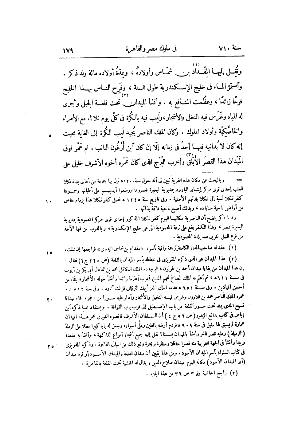 واستمرّ الماء فى خليج الإسكندرية طول السنة، وفرح الناس بهذا الخليج فرحا زائدا، وعظمت المنافع به. وأنشأ الميدان «2» تحت قلعة الجبل وأجرى له المياه وغرس فيه النخل والأشجار، ولعب فيه بالكرة فى كلّ يوم ثلاثاء مع الأمراء والخاصّكيّة وأولاد الملوك. وكان الملك الناصر يجيد لعب الكرة إلى الغاية بحيث إنه كان لا يدانيه فيها أحد فى زمانه إلّا إن كان ابن أرغون النائب. ثم عمّر فوق الميدان هذا القصر الأبلق «3» وأخرب البرج الذي كان عمّره أخوه الأشرف خليل على