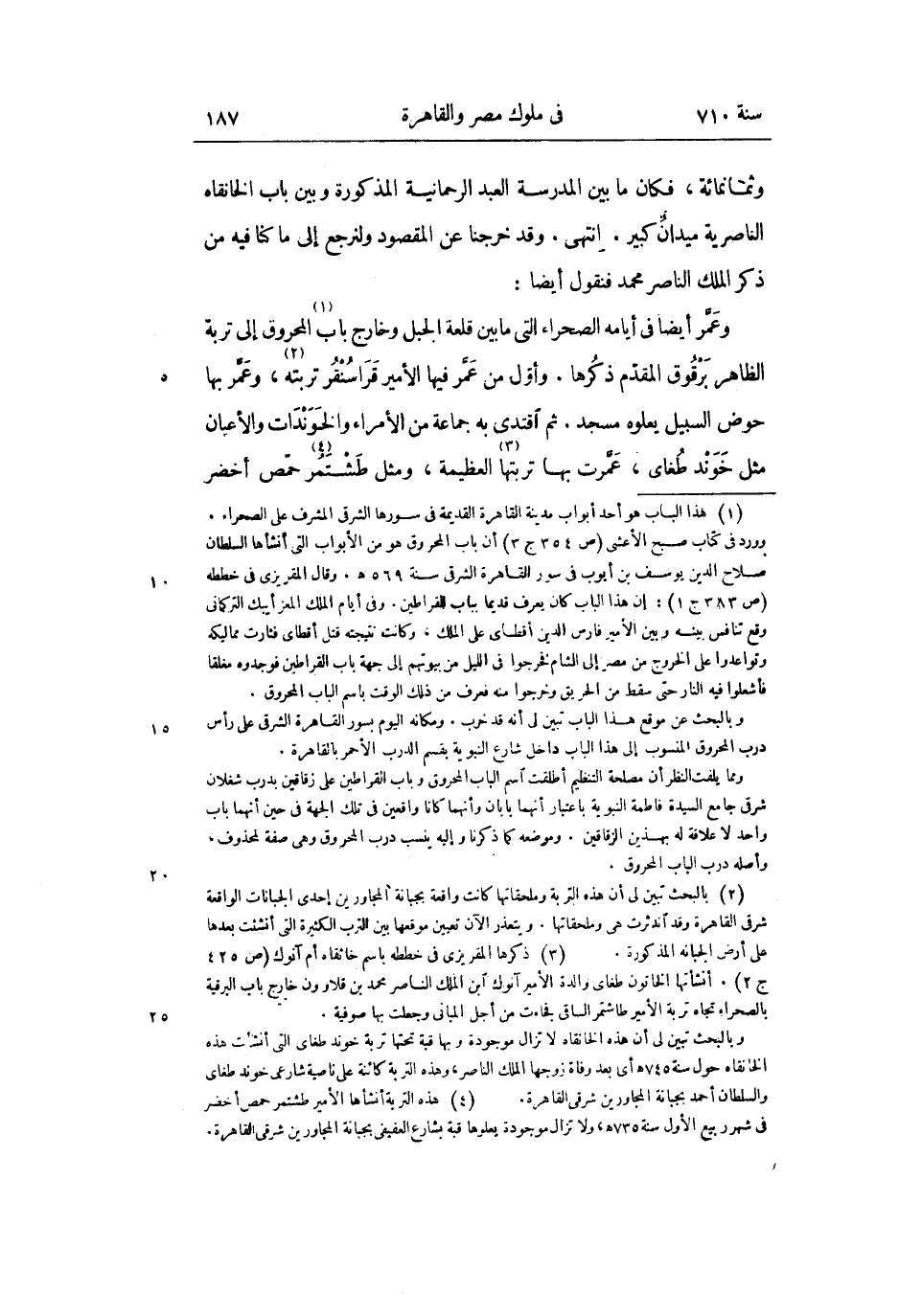 وثمانمائة، فكان ما بين المدرسة العبد الرحمانية المذكورة وبين باب الخانقاه الناصرية ميدان كبير. انتهى. وقد خرجنا عن المقصود ولنرجع إلى ما كنا فيه من ذكر الملك الناصر محمد فنقول أيضا: