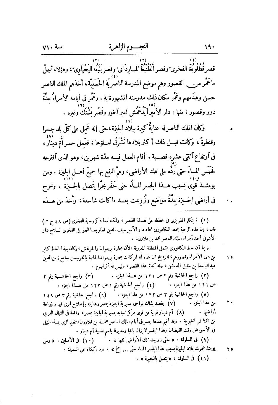 وكان الملك الناصر له عناية كبيرة ببلاد «7» الجيزة، حتى إنه عمل على كلّ بلد جسرا وقنطرة، وكانت قبل ذلك أكثر بلادها تشرق لعلوّها، فعمل جسر أمّ دينار «8» ، فى ارتفاع اثنتى عشرة قصبة. أقام العمل فيه مدّة شهرين، وهو الذي اقترحه فحبس الماء حتى ردّه «9» على تلك الأراضى، وعمّ النفع بها جميع أهل الجيزة. ومن يومئذ قوى «10» بسبب هذا الجسر الماء حتى حفر بحرا يتّصل بالجيزة «11» . وخرج فى أراضى الجيزة عدّة مواضع وزرعت بعد ما كانت شاسعة، وأخذ من هذه