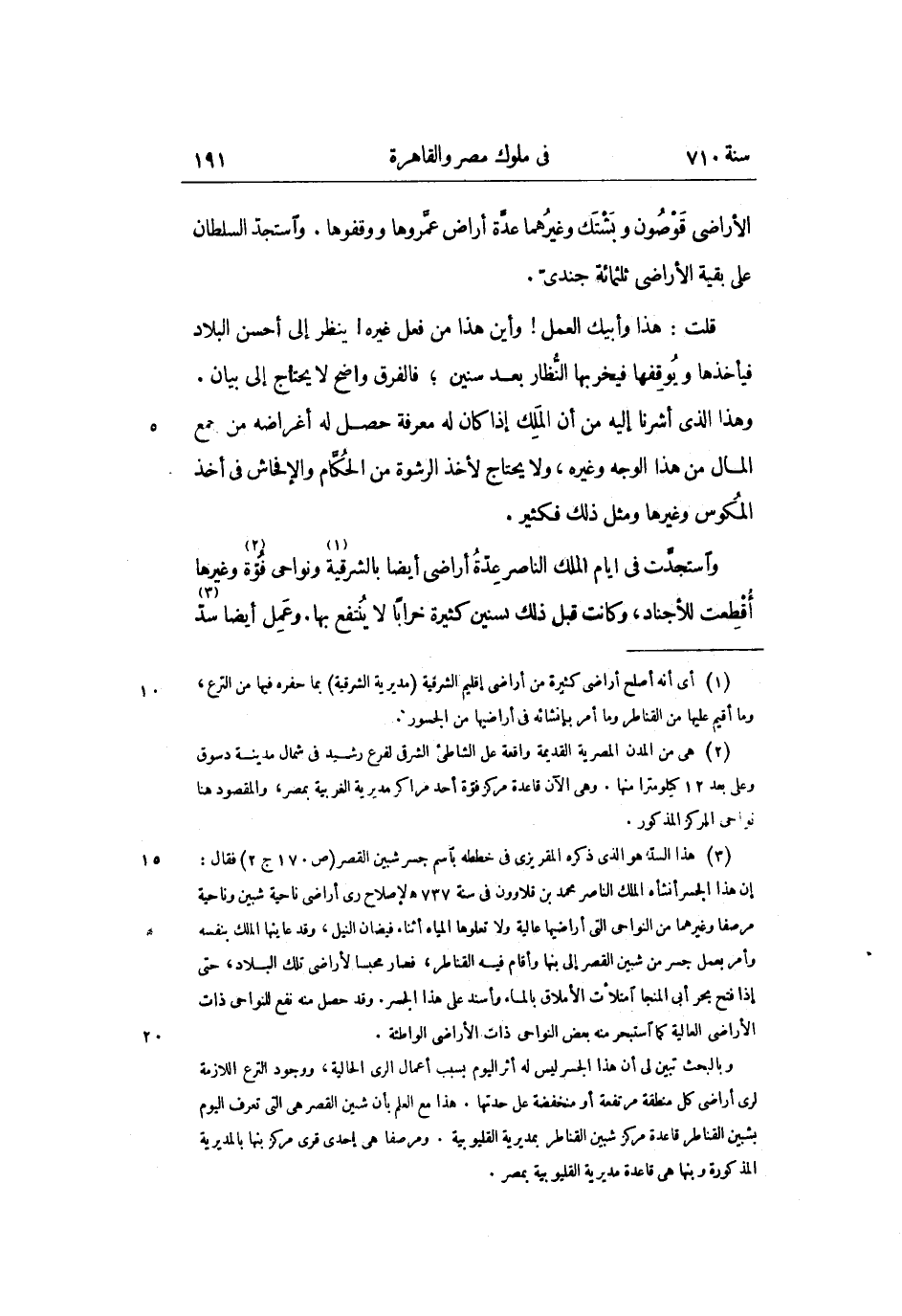 واستجدّت فى ايام الملك الناصر عدّة أراضى أيضا بالشرقية «1» ونواحى فوّة «2» وغيرها أقطعت للأجناد، وكانت قبل ذلك لسنين كثيرة خرابا لا ينتفع بها. وعمل أيضا سدّ «3»