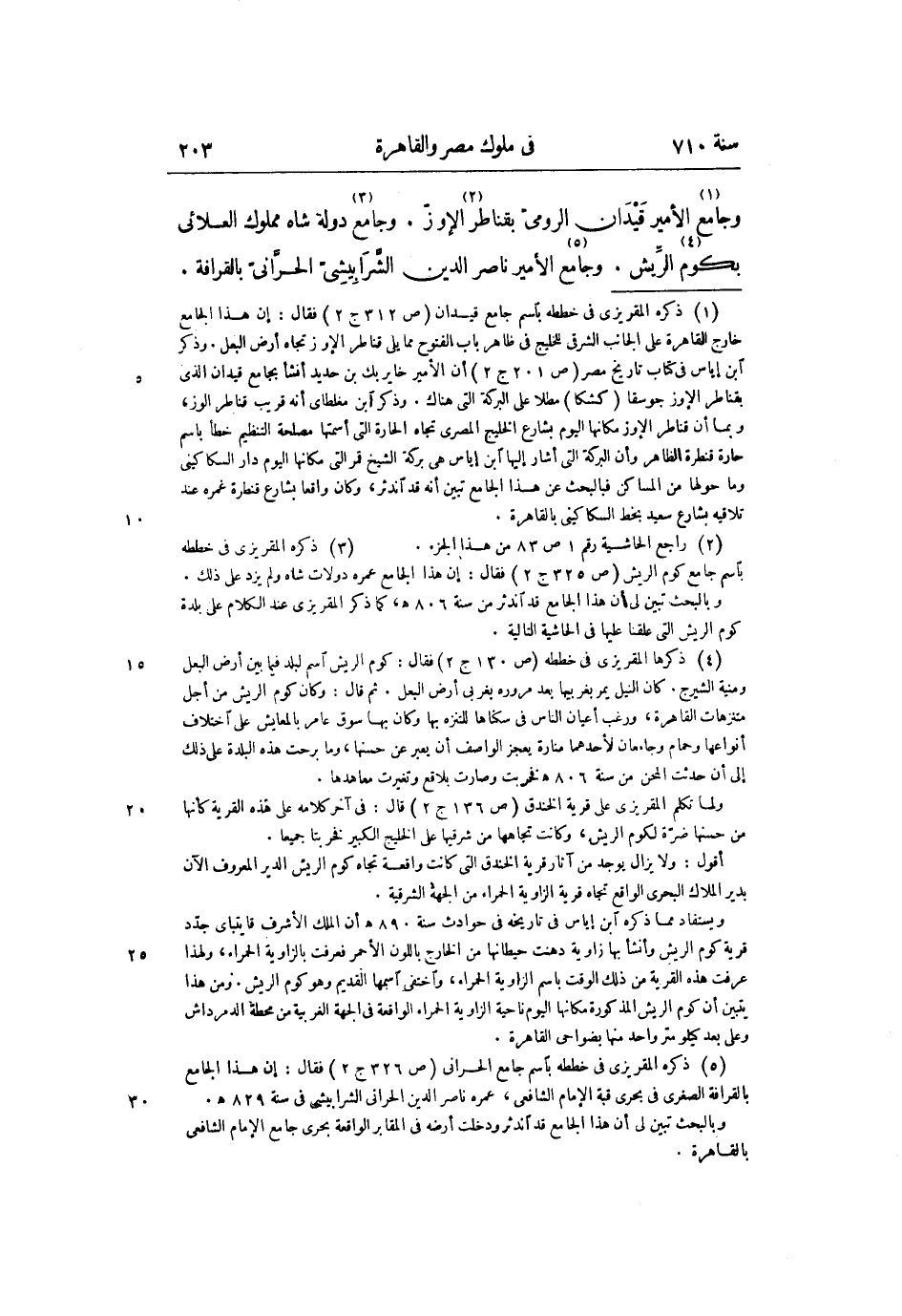 وجامع «1» الأمير قيدان الرومىّ بقناطر «2» الإوزّ. وجامع «3» دولة شاه مملوك العلائى بكوم «4» الرّيش. وجامع «5» الأمير ناصر الدين الشّرابيشىّ الحرّانىّ بالقرافة.