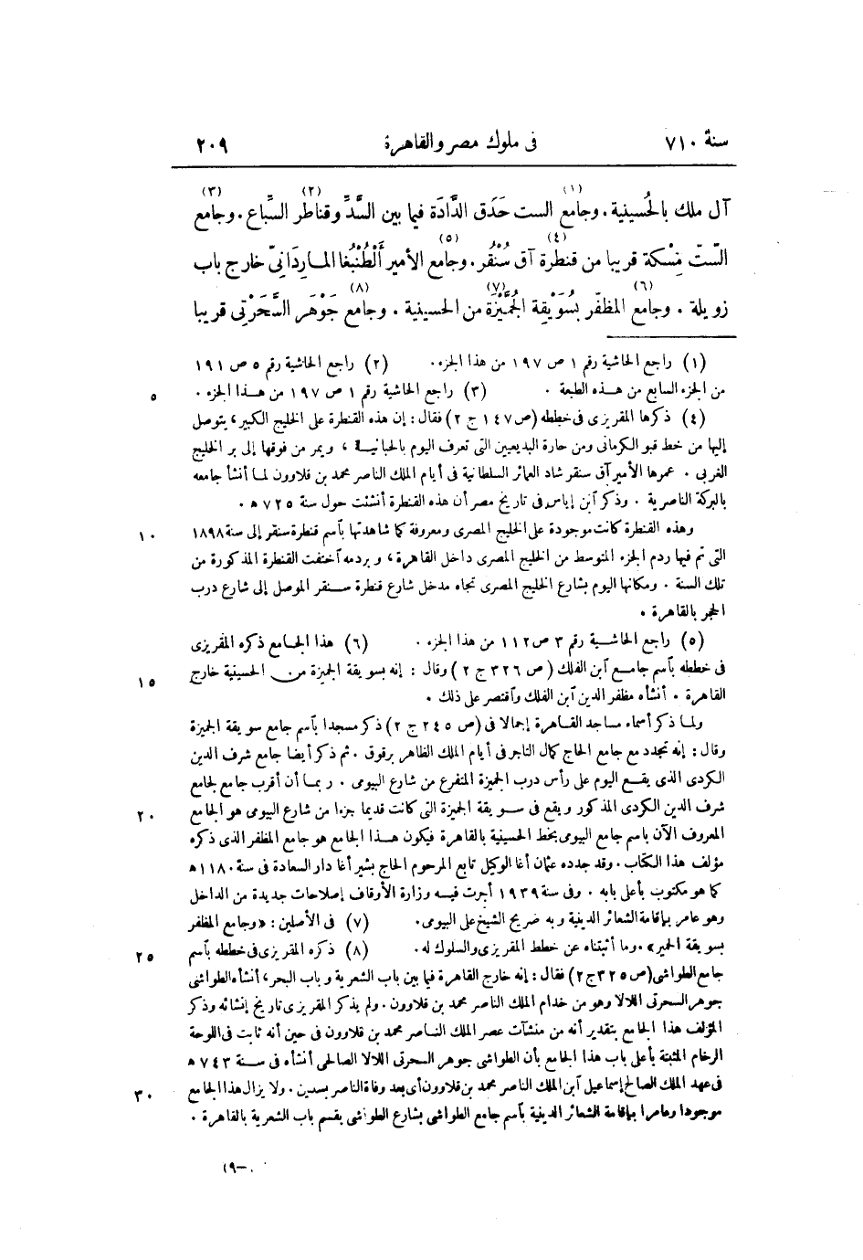 آل ملك بالحسينية. وجامع «1» الست حدق الدّادة فيما بين السّدّ وقناطر «2» السّباع. وجامع «3» السّتّ مسكة قريبا من قنطرة «4» آق سنقر. وجامع «5» الأمير ألطنبغا الماردانىّ خارج باب زويلة. وجامع «6» المظفّر بسويقة الجمّيزة «7» من الحسينية. وجامع «8» جوهر السّحرتى قريبا