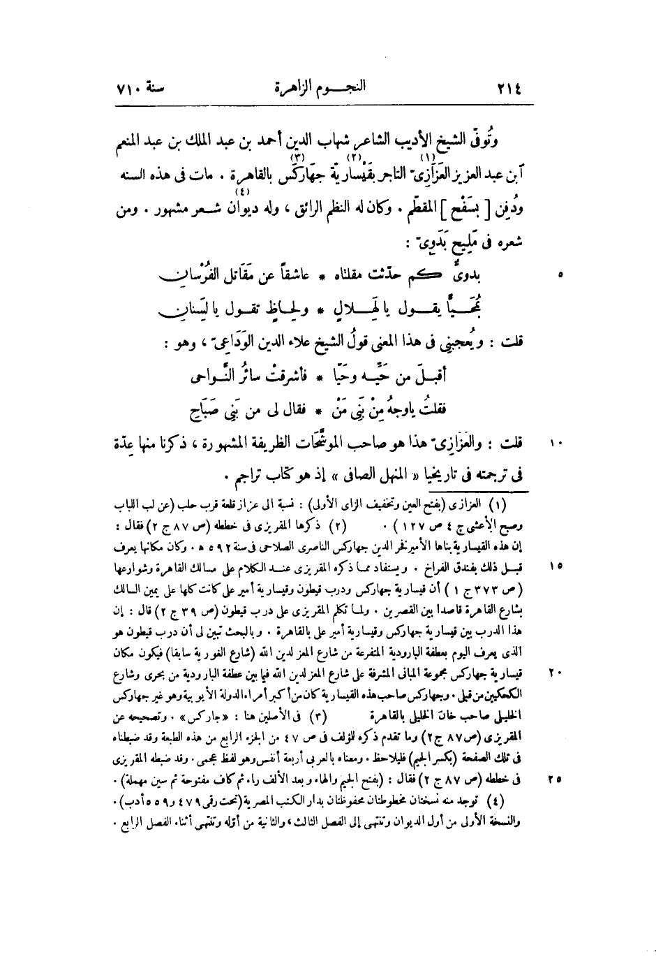 وتوفّى الشيخ الأديب الشاعر شهاب الدين أحمد بن عبد الملك بن عبد المنعم ابن عبد العزيز العزازىّ «1» التاجر بقيساريّة «2» جهاركس «3» بالقاهرة. مات فى هذه السنه ودفن [بسفح] المقطّم. وكان له النظم الرائق، وله ديوان «4» شعر مشهور. ومن شعره فى مليح بدوىّ: