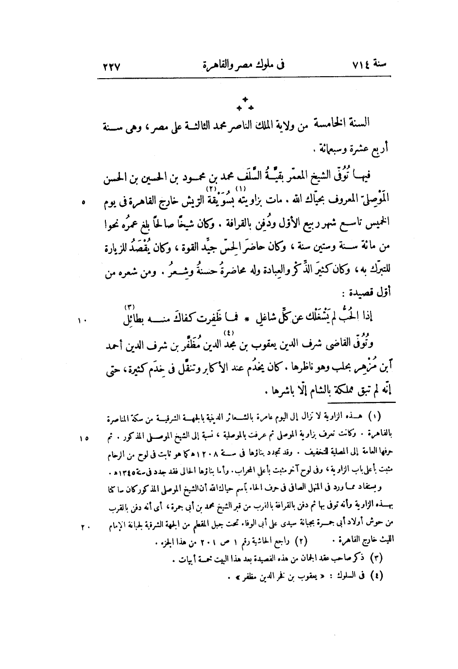 فيها توفّى الشيخ المعمّر بقيّة السّلف محمد بن محمود بن الحسين بن الحسن الموصلىّ المعروف بحيّاك الله. مات بزاويته «1» بسويقة «2» الرّيش خارج القاهرة فى يوم الخميس تاسع شهر ربيع الأوّل ودفن بالقرافة. وكان شيخا صالحا بلغ عمره نحوا من مائة سنة وستين سنة، وكان حاضر الحسّ جيّد القوة، وكان يقصد للزيارة للتبرّك به، وكان كثير الذّكر والعبادة وله محاضرة حسنة وشعر. ومن شعره من أوّل قصيدة:
