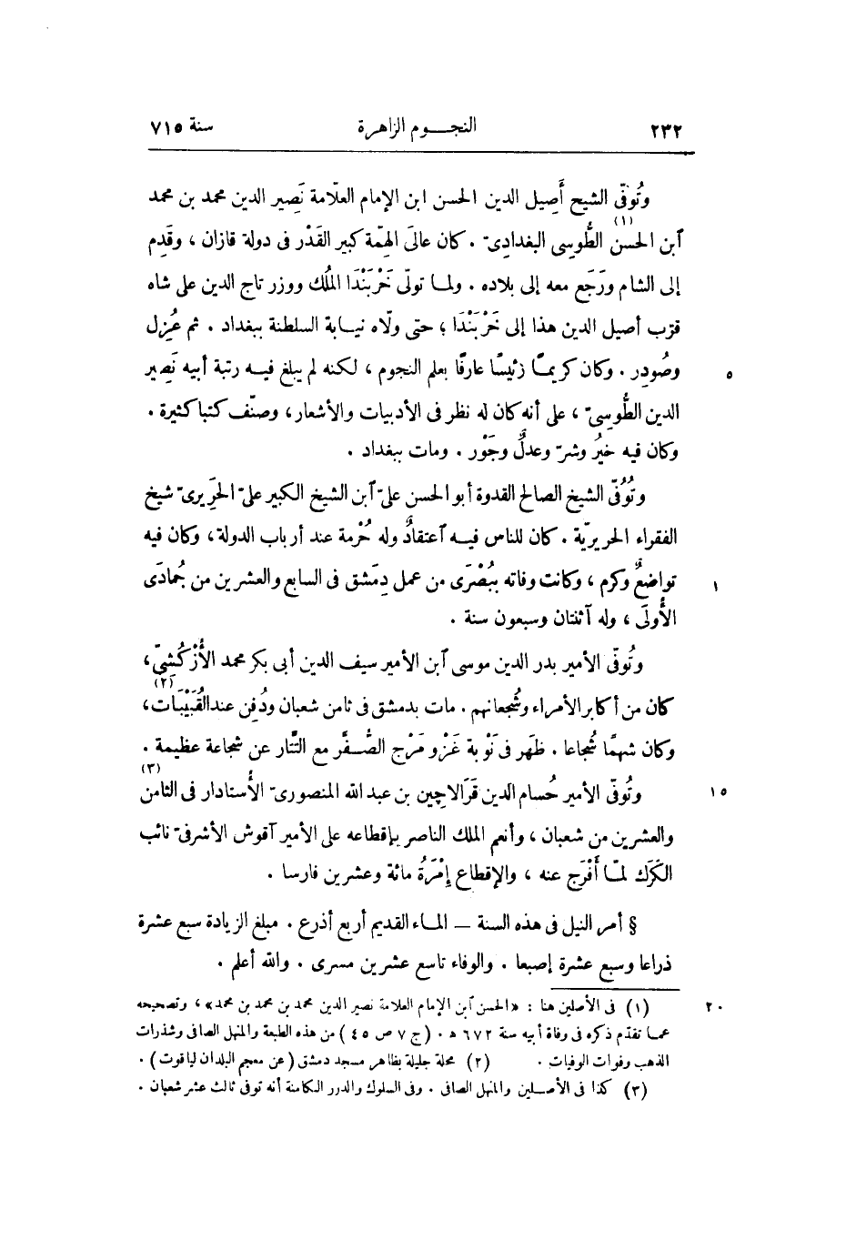 وتوفّى الشيخ أصيل الدين الحسن ابن الإمام العلّامة نصير الدين محمد بن محمد ابن الحسن «1» الطّوسى البغدادىّ. كان عالى الهمّة كبير القدر فى دولة قازان، وقدم إلى الشام ورجع معه إلى بلاده. ولما تولّى خربندا الملك ووزر تاج الدين على شاه قرّب أصيل الدين هذا إلى خربندا؛ حتى ولّاه نيابة السلطنة ببغداد. ثم عزل وصودر. وكان كريما رئيسا عارفا بعلم النجوم، لكنه لم يبلغ فيه رتبة أبيه نصير الدين الطّوسىّ، على أنه كان له نظر فى الأدبيات والأشعار، وصنّف كتبا كثيرة.