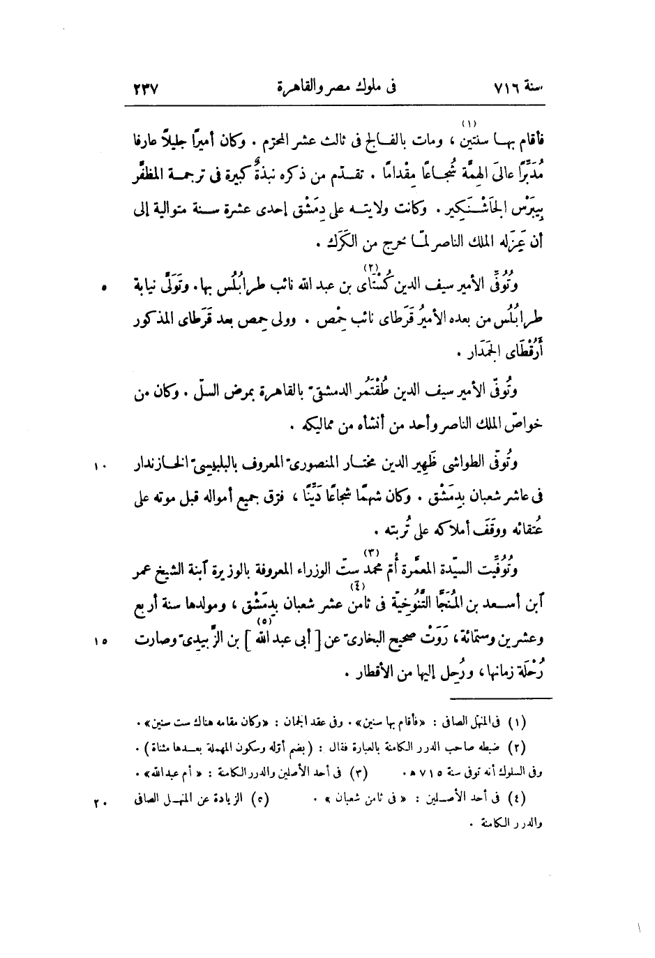 فأقام بها سنتين «1» ، ومات بالفالج فى ثالث عشر المحرّم. وكان أميرا جليلا عارفا مدبّرا عالى الهمّة شجاعا مقداما. تقدّم من ذكره نبذة كبيرة فى ترجمة المظفّر بيبرس الجاشنكير. وكانت ولايته على دمشق إحدى عشرة سنة متوالية إلى أن عزله الملك الناصر لمّا خرج من الكرك.