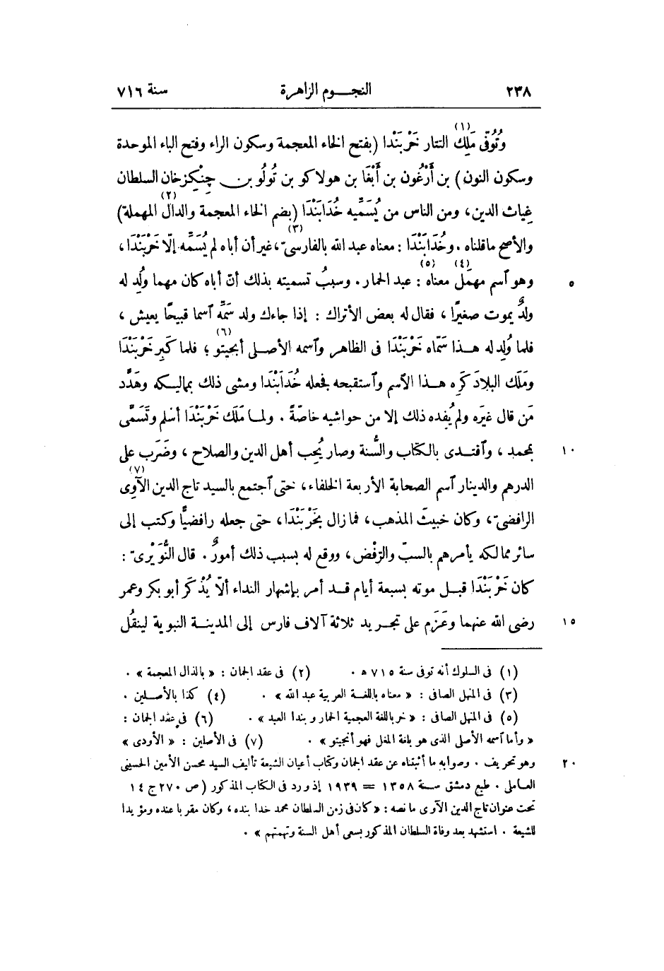 وتوفّى ملك «1» التتار خربندا (بفتح الخاء المعجمة وسكون الراء وفتح الباء الموحدة وسكون النون) بن أرغون بن أبغا بن هولاكو بن تولو بن چنكزخان السلطان غياث الدين، ومن الناس من يسمّيه خدابندا (بضم الخاء المعجمة والدال «2» المهملة) والأصح ما قلناه. وخدابندا: معناه عبد الله بالفارسىّ «3» ، غير أن أباه لم يسمّه إلّا خربندا، وهو اسم مهمل «4» معناه «5» : عبد الحمار. وسبب تسميته بذلك أنّ أباه كان مهما ولد له ولد يموت صغيرا، فقال له بعض الأتراك: إذا جاءك ولد سمّه اسما قبيحا يعيش، فلما ولد له هذا سمّاه خربندا فى الظاهر واسمه الأصلى أبحيتو «6» ؛ فلما كبر خربندا وملك البلاد كره هذا الاسم واستقبحه فجعله خدابندا ومشى ذلك بمماليكه وهدّد من قال غيره ولم يفده ذلك إلا من حواشيه خاصّة. ولما ملك خربندا أسلم وتسمّى بمحمد، واقتدى بالكتاب والسّنة وصار يحب أهل الدين والصلاح، وضرب على الدرهم والدينار اسم الصحابة الأربعة الخلفاء، حتى اجتمع بالسيد تاج الدين الآوى «7» الرافضىّ، وكان خبيث المذهب، فما زال بخربندا، حتى جعله رافضيّا وكتب إلى سائر ممالكه يأمرهم بالسبّ والرّفض، ووقع له بسبب ذلك أمور. قال النّويرىّ: