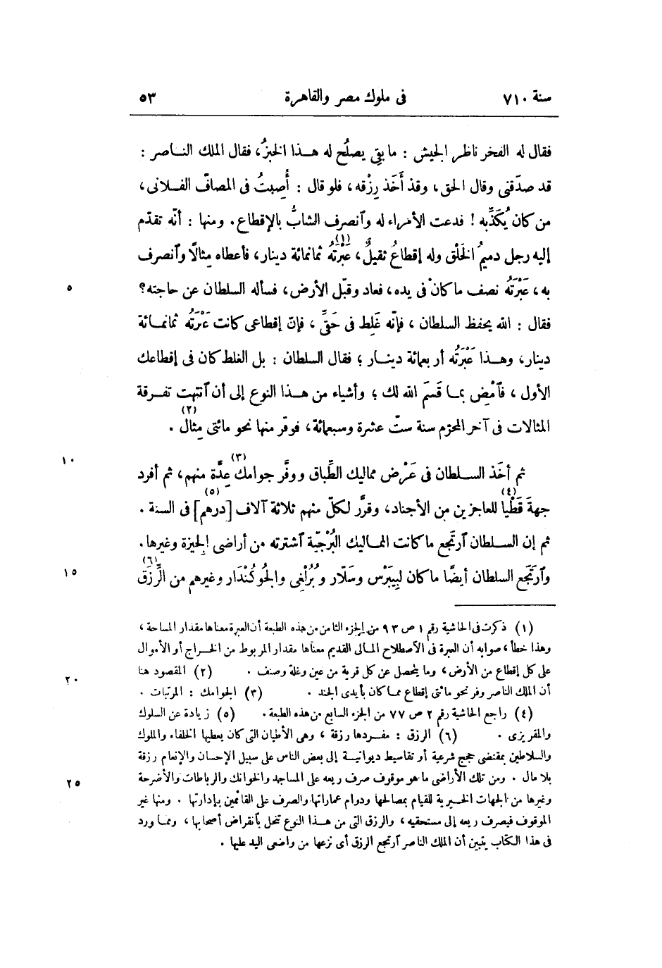 فقال: الله يحفظ السلطان، فإنّه غلط فى حقّى، فإنّ إقطاعى كانت عبرته ثمانمائة دينار، وهذا عبرته أربعمائة دينار؛ فقال السلطان: بل الغلط كان فى إقطاعك الأول، فامض بما قسم الله لك؛ وأشياء من هذا النوع إلى أن انتهت تفرقة المثالات فى آخر المحرّم سنة ستّ عشرة وسبعمائة، فوقر منها نحو مائتى مثال «2» .