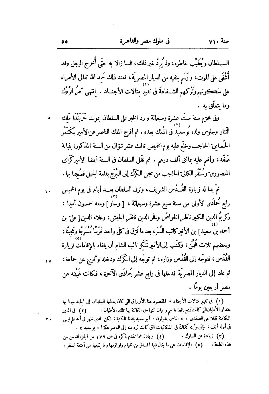 ثمّ بدا له زيارة القدس الشريف، ونزل السلطان بعد أيام فى يوم الخميس رابع جمادى الأولى من سنة سبع عشرة وسبعمائة، [وسار «3» ] ومعه خمسون أميرا، وكريم الدين الكبير ناظر الخواصّ وفخر الدين ناظر الجيش، وعلاء الدين [علىّ بن أحمد بن «4» سعيد] بن الأثير كاتب السّرّ، بعد ما فرّق فى كلّ واحد فرسا مسرجا وهجينا، وبعضهم ثلاث هجن، وكتب إلى الأمير تنكز نائب الشام أن يلقاه بالإقامات «5» لزيارة القدس، فتوجّه إلى القدس وزاره، ثم توجّه إلى الكرك ودخله وأفرج عن جماعة، ثم عاد إلى الديار المصريّة فدخلها فى رابع عشر جمادى الآخرة، فكانت غيبته عن مصر أربعين يوما.