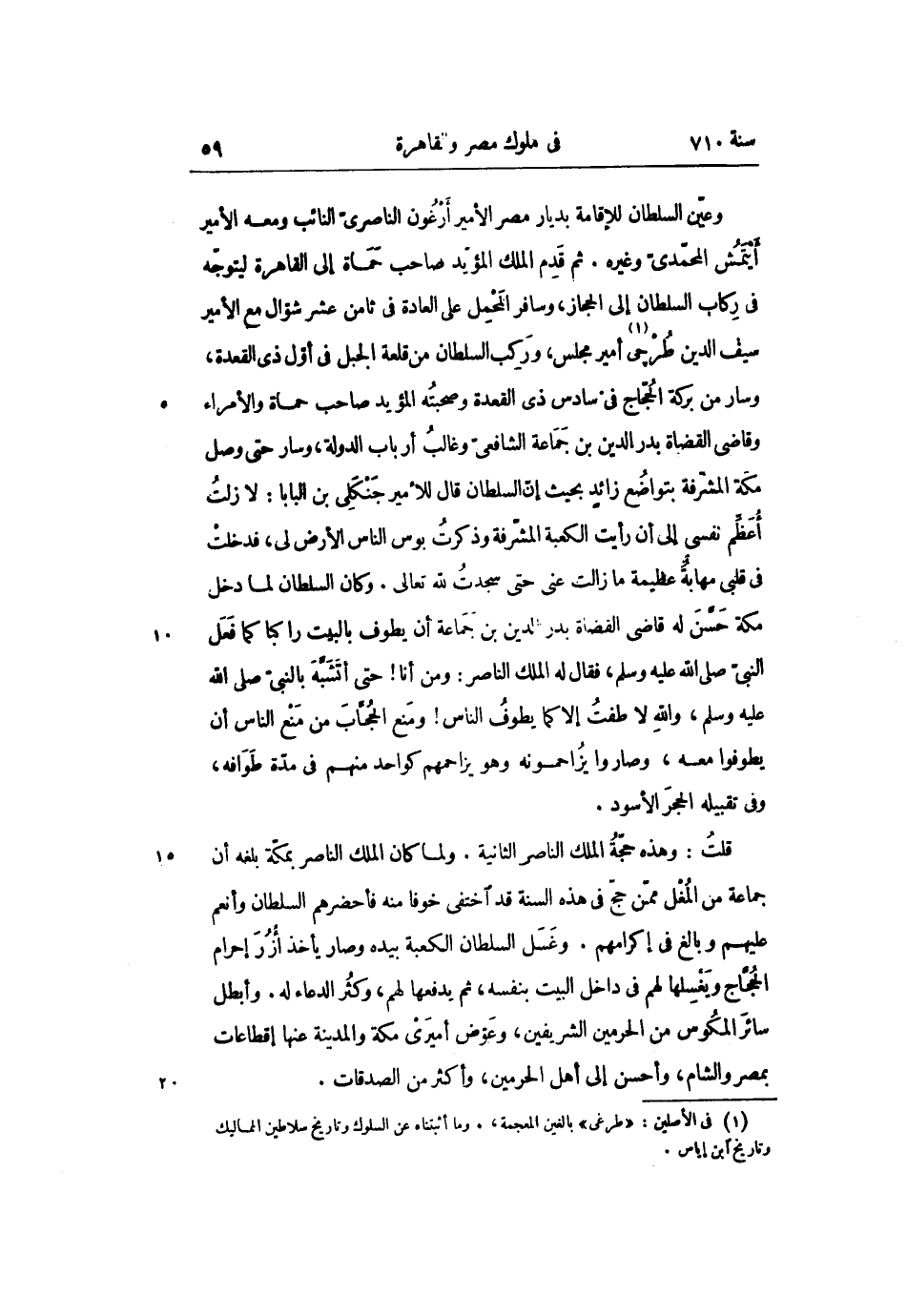 قلت: وهذه حجّة الملك الناصر الثانية. ولما كان الملك الناصر بمكّة بلغه أن جماعة من المغل ممّن حجّ فى هذه السنة قد اختفى خوفا منه فأحضرهم السلطان وأنعم عليهم وبالغ فى إكرامهم. وغسل السلطان الكعبة بيده وصار يأخذ أزر إحرام الحجّاج ويغسلها لهم فى داخل البيت بنفسه، ثم يدفعها لهم، وكثر الدعاء له. وأبطل سائر المكوس من الحرمين الشريفين، وعوّض أميرى مكة والمدينة عنها إقطاعات بمصر والشام، وأحسن إلى أهل الحرمين، وأكثر من الصدقات.