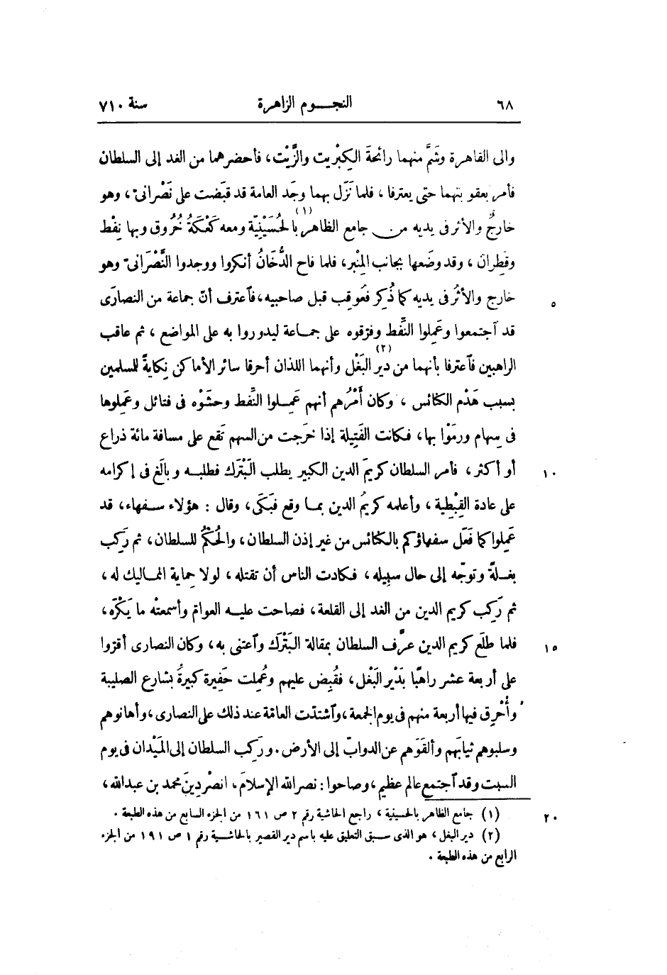 والى القاهرة وشمّ منهما رائحة الكبريت والزّيت، فأحضرهما من الغد إلى السلطان فأمر بعقوبتهما حتى يعترفا، فلما نزل بهما وجد العامة قد قبضت على نصرانىّ، وهو خارج والأثر فى يديه من جامع الظاهر «1» بالحسينيّة ومعه كعكة خروق وبها نفط وقطران، وقد وضعها بجانب المنبر، فلما فاح الدّخان أنكروا ووجدوا النّصرانىّ وهو خارج والأثر فى يديه كما ذكر فعوقب قبل صاحبيه، فاعترف أنّ جماعة من النصارى قد اجتمعوا وعملوا النّفط وفرّقوه على جماعة ليدوروا به على المواضع، ثم عاقب الراهبين فاعترفا بأنهما من دير «2» البغل وأنهما اللذان أحرقا سائر الأماكن نكاية للمسلمين بسبب هدم الكنائس، وكان أمرهم أنهم عملوا النّفط وحشوه فى فتائل وعملوها فى سهام ورموا بها، فكانت الفتيلة إذا خرجت من السهم تقع على مسافة مائة ذراع أو أكثر، فأمر السلطان كريم الدين الكبير يطلب البترك فطلبه وبالغ فى إكرامه على عادة القبطية، وأعلمه كريم الدين بما وقع فبكى، وقال: هؤلاء سفهاء، قد عملوا كما فعل سفهاؤكم بالكنائس من غير إذن السلطان، والحكم للسلطان، ثم ركب بغلة وتوجّه إلى حال سبيله، فكادت الناس أن تقتله، لولا حماية المماليك له، ثم ركب كريم الدين من الغد إلى القلعة، فصاحت عليه العوامّ وأسمعته ما يكره، فلما طلع كريم الدين عرّف السلطان بمقالة البترك واعتنى به، وكان النصارى أقرّوا على أربعة عشر راهبا بدير البغل، فقبض عليهم وعملت حفيرة كبيرة بشارع الصليبة وأحرق فيها أربعة منهم فى يوم الجمعة، واشتدّت العامّة عند ذلك على النصارى، وأهانوهم وسلبوهم ثيابهم وألقوهم عن الدوابّ إلى الأرض. وركب السلطان إلى الميدان فى يوم السبت وقد اجتمع عالم عظيم، وصاحوا: نصر الله الإسلام، انصر دين محمد بن عبد الله،
